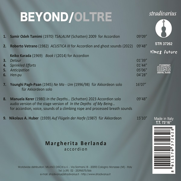 Margherita Berlanda besitzt die Fähigkeit, ihr Akkordeon nicht nur technisch perfekt zu beherrschen und in- und auswendig zu kennen, sondern ihm auch regelmäßig in die Seele zu schauen. Sie entlockt ihrem Instrument sphärische und doch geerdete Töne. Berlanda erforscht das Unbekannte und liebt es, über den Tellerrand zu schauen. Es ist kein Zufall, dass sie ihr neues Projekt „Beyond/Oltre“ nennt. Sie hat Musikstücke zusammengestellt, die sie als Interpretin herausfordern, verschiedenste Grenzen zu überwinden: klangliche, physikalische, ideologische Grenzen. Dabei macht die junge Musikerin das Akkordeon zu einem Instrument der Entdeckung und Offenbarung. Mit künstlerischem Weitblick nimmt sie uns mit auf eine Reise, bei der die musikalische Landschaft in ständigem Wandel begriffen ist.