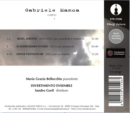 Maria Grazia Bellocchio und das Divertimento Ensemble spielen auf diesem Album Werke des italienischen Komponisten Gabriele Manca. „Il dodicesimo studio“ wurde in Erinnerung an Antonio Sardi de Letto geschrieben, der 2008 die ersten elf Klavierstudien auf dem Album „Studi per il XXI secolo“ (“Studien für das 21. Jahrhundert") aufgenommen hatte. „Senti! Aspetta!“ wurde in zwei Etappen komponiert: der erste Teil für Klavier solo wurde zwischen 2018 und 2019 fertiggestellt, dem 2020 die instrumentale ‚Coda‘ hinzugefügt wurde, eine Art gewaltiger ‚Nachhall‘ des zuvor Gehörten. „Offese fantastiche“ ist eine Serie von sieben sehr kurzen Stücken für Soloklavier, die jeweils eine elementare musikalische Idee erforschen, die radikal in ihrer bloßen Nacktheit präsentiert wird.