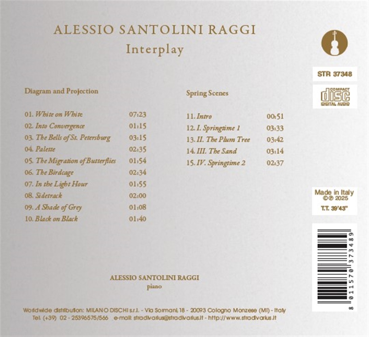 Das Album „Interplay: Duet for One and for the Other“ vereint zwei Werke für Klavier und Disklavier – „Diagram and Projection“ und „Spring Scenes“ –, die hier vom Komponisten Alessio Santolini Raggi eingespielt wurden. Das Disklavier (von Yamaha) ist ein akustisches Klavier, das mit elektronischen Sensoren zur Aufzeichnung und elektromechanischen Magneten für die Wiedergabe im Stil eines Selbstspielklaviers ausgestattet ist. Sensoren zeichnen die Bewegungen der Tasten, Hämmer und Pedale während einer Darbietung auf, und das System speichert die Aufführungsdaten. Bei der Wiedergabe bewegen die Magnetspulen die Tasten und Pedale und reproduzieren so die ursprüngliche Darbietung.