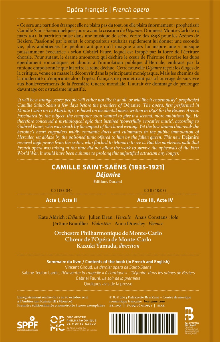 „Es wird eine merkwürdige Partitur sein: entweder wird sie den Leuten überhaupt nicht gefallen oder sie werden sie sehr mögen", prophezeite Camille Saint-Saëns einige Tage vor der Premiere von „Déjanire“. Die Oper, die am 14. März 1911 in Monte Carlo uraufgeführt wurde, basiert auf einer Bühnenmusik, die 1898 für die Arena von Béziers geschrieben wurde. Der Komponist war von diesem Thema fasziniert und wollte ihm bald ein zweites, ehrgeizigeres Leben geben. Das Liebesdrama, das der Heldin das Herz zerreißt, führt zu wildromantischen Duetten und gipfelt in der öffentlichen Selbstverbrennung des Herkules, der durch die vergiftete Tunika, die ihm die gefallene Königin angeboten hat, in Flammen aufgeht. Diese neue „Déjanire“ wurde von den Kritikern hoch gelobt, die in Scharen nach Monaco kamen, um sie zu sehen. Doch der modernistische Weg, den die französische Oper zu dieser Zeit einschlug, erlaubte es dem Werk nicht, die Wirren des Ersten Weltkriegs zu überstehen. Zum Glück wurde sie nun zu neuem Leben erweckt.