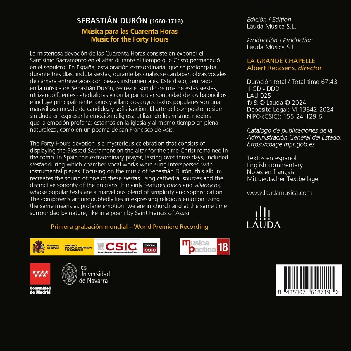 Die Vierzig-Stunden-Andacht ist eine mystische Feier, bei der das Allerheiligste auf dem Altar für die Zeit ausgestellt wird, die Christus im Grab verbracht hat. In Spanien umfasst dieses außergewöhnliche Gebet, das über drei Tage dauert, Siestas, bei denen Kammergesangswerke gesungen und mit Instrumentalstücken durchsetzt werden. Dieses Album konzentriert sich auf die Musik von Sebastián Durón und gibt den Klang einer dieser Siestas mit Hilfe von Quellen aus der Kathedrale und der charakteristischen Klangfülle der Dulziane wieder. Es enthält hauptsächlich Tonos und Villancicos, deren populäre Texte eine wunderbare Mischung aus Einfachheit und Raffinesse sind. Die Kunst des Komponisten bestand zweifellos darin, religiöse Emotionen mit denselben Mitteln auszudrücken wie profane Emotionen: Wir befinden uns in einer Kirche und sind gleichzeitig von der Natur umgeben, wie in einem Gedicht des Heiligen Franz von Assisi.