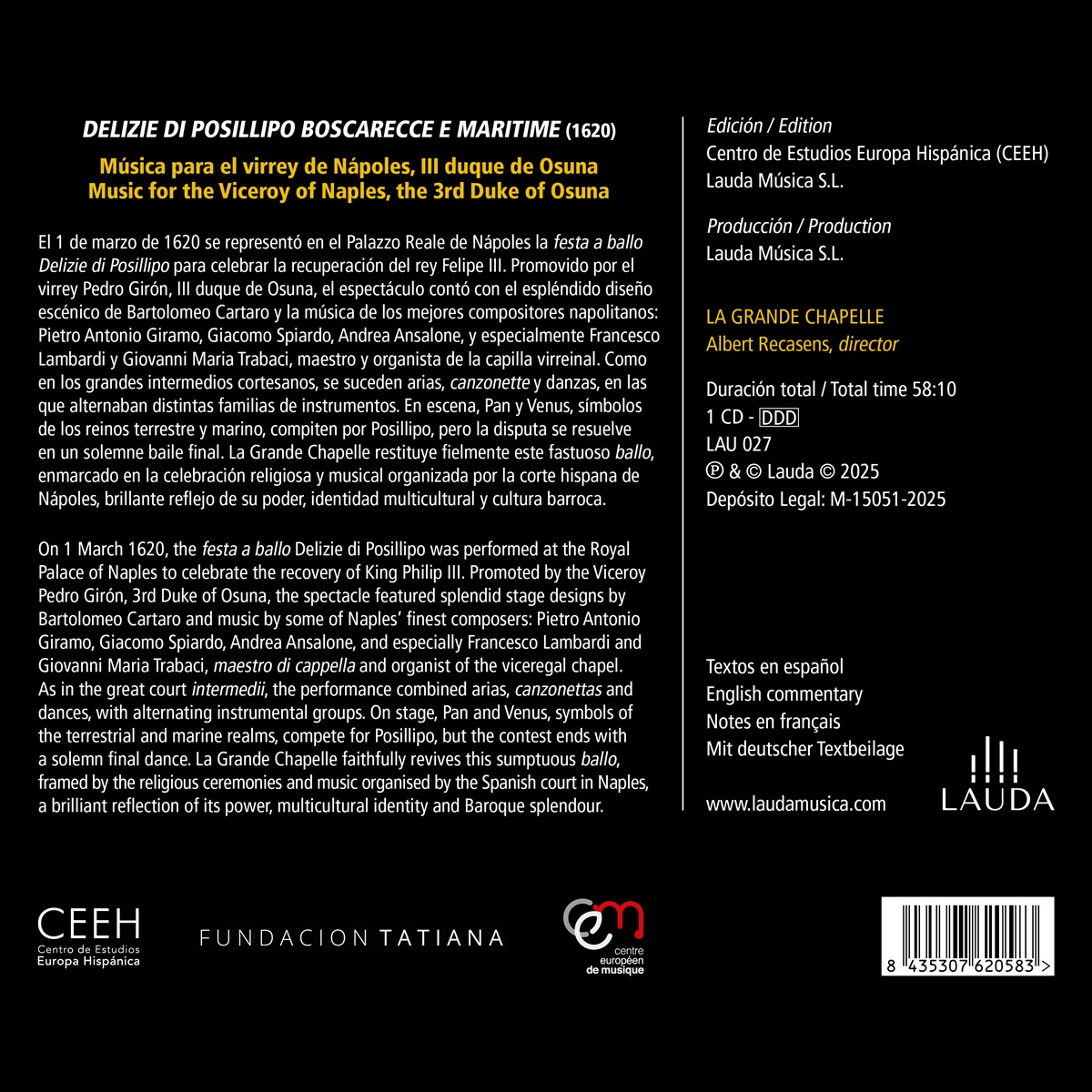 Am 1. März 1620 wurde im Königspalast von Neapel die „festa a ballo Delizie di Posillipo“ aufgeführt, um die Genesung König Philipps III. zu feiern. Auf Initiative des Vizekönigs Pedro Girón, des 3. Herzogs von Osuna, entstand dieses prächtige Spektakel mit großartigen Bühnenbildern von Bartolomeo Cartaro und Musik einiger der besten neapolitanischen Komponisten: Pietro Antonio Giramo, Giacomo Spiardo, Andrea Ansalone sowie insbesondere Francesco Lambardi und Giovanni Maria Trabaci, Maestro di cappella und Organist der vizeköniglichen Kapelle.