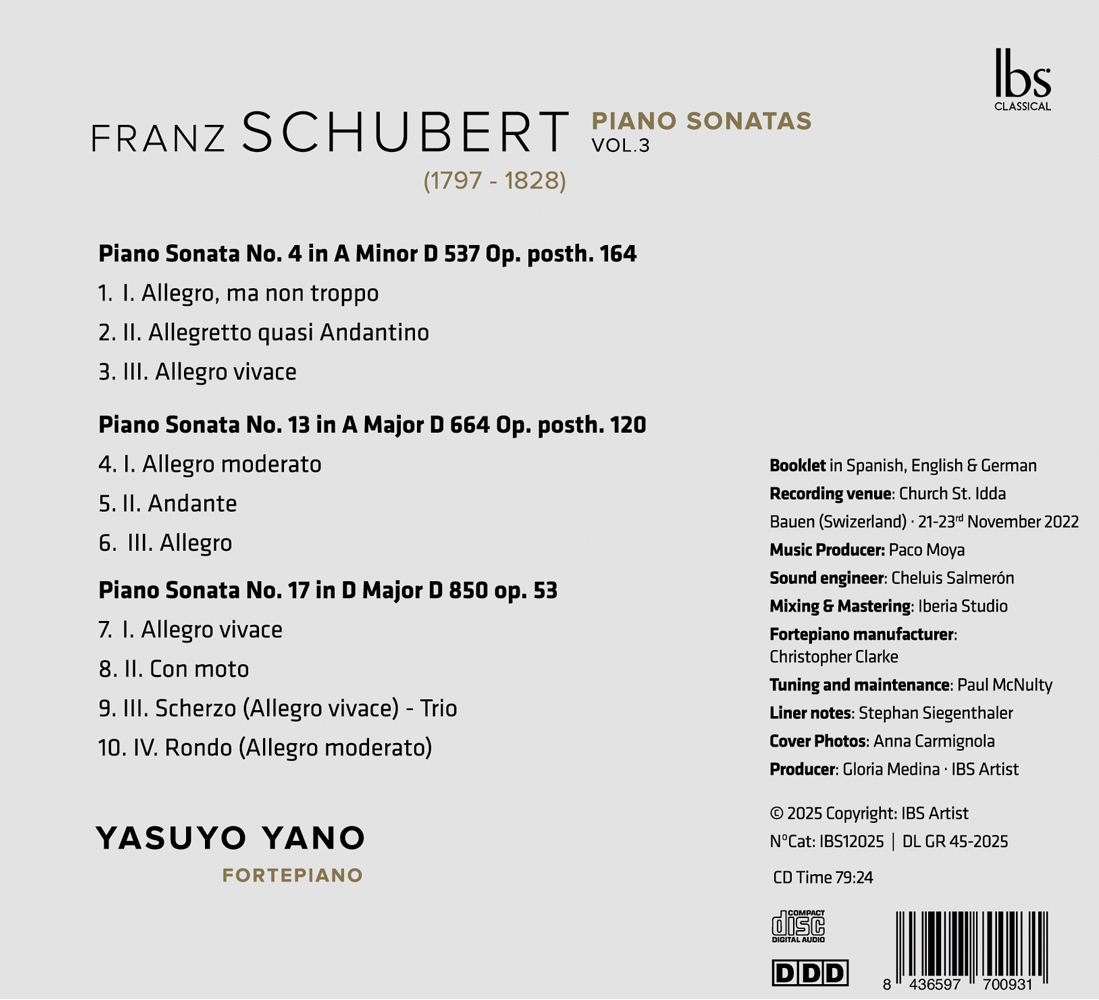 Dies ist der dritte Teil der vollständigen Klaviersonaten Franz Schuberts, aufgeführt von der japanischen Fortepianistin Yasuyo Yano, Professorin an der Hochschule Luzern, und die Stücke wurden in der Schweiz auf einem Christopher-Clarke-Fortepiano aufgenommen. Yasuyo Yano wurde in Tokio geboren. Ihre Lehrer waren Midori Matsubara, dann Sergio Perticaroli und Carla Giudici an der Academia Nazionale di Santa Cecilia in Rom. Yano lebt heute in der Schweiz, wo sie an der Hochschule Luzern Klavier, Fortepiano und Kammermusik unterrichtet. Sie gibt Solokonzerte und tritt auch als Kammermusikerin auf, sowohl auf dem Fortepiano als auch auf dem modernen Klavier. Sie entdeckte das Fortepiano, nachdem sie in Venedig die Sonaten für Violine und Klavier von Wolfgang Amadeus Mozart gespielt hatte und ein Musikerkollege ihr vorschlug, dieses ältere Instrument auszuprobieren. Sie war begeistert davon, wie das Fortepiano es ihr ermöglicht, sich vorzustellen und zu hören, wie die Musik damals geklungen haben muss, und wie sehr es sich von modernen Klavieren unterscheidet, denn es bietet ein großes Spektrum an kreativem Spielraum durch eine reiche Palette an Klangfarben, einem großen Dynamikumfang und der empfindlichen Reaktion der Tastatur auf Berührung.