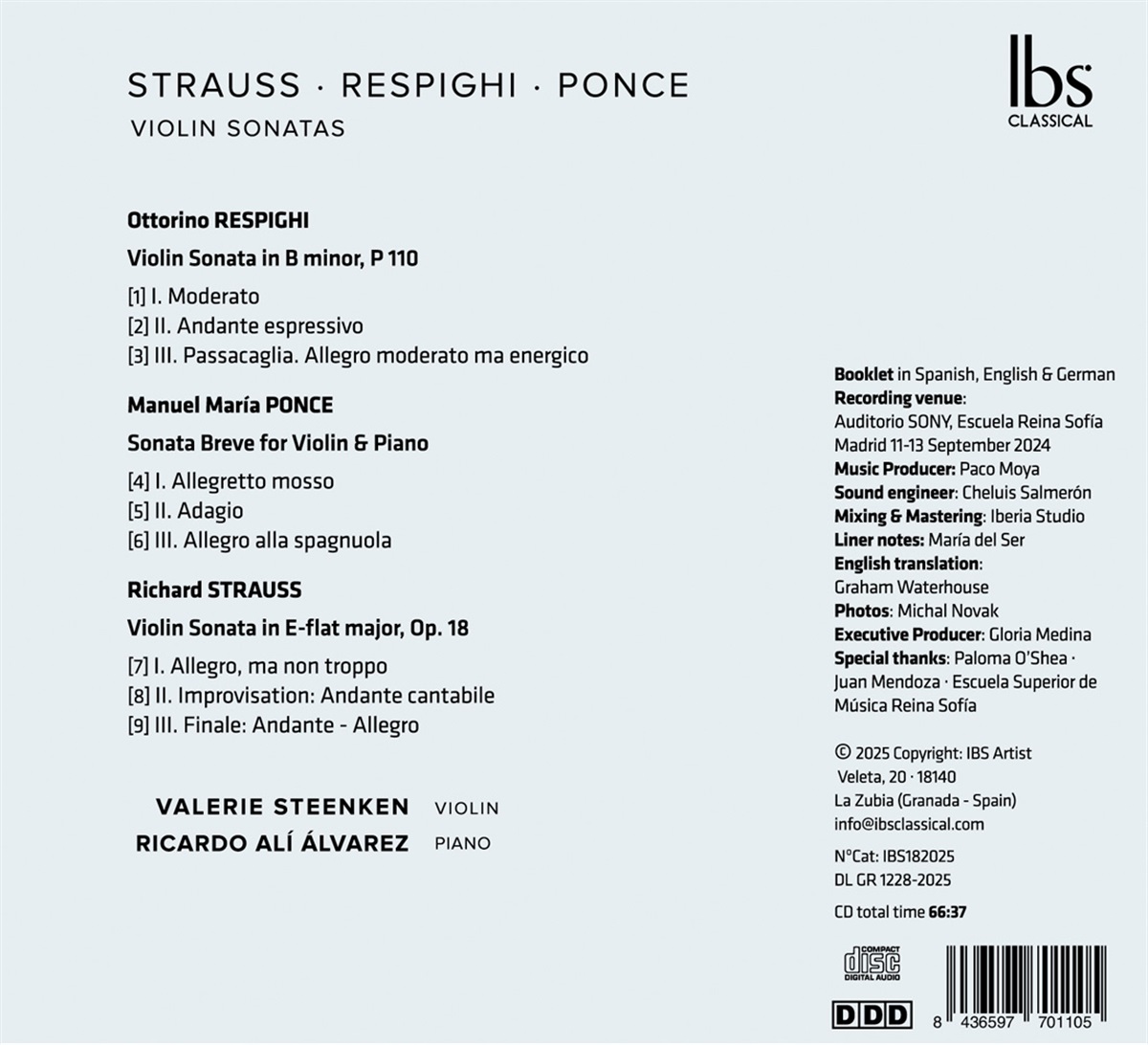 Auf diesem neuen Album spielen die Violinistin Valerie Steenken und der Pianist Ricardo Alí Álvarez drei bedeutende Violinsonaten von Richard Strauss, Ottorino Respighi und Manuel M. Ponce. Das Programm, das als Reise durch deutsche, italienische und mexikanische Traditionen konzipiert ist, schlägt eine Brücke zwischen spätromantischem lyrischen Stil und moderner Ausdruckskraft des frühen 20. Jahrhunderts. Strauss' frühe Sonate in Es-Dur, Op. 18, verbindet hochfliegende melodische Erfindungskraft mit sinfonischer Breite, während Respighis Sonate in h-Moll sich als großartige, rhetorisch aufgeladene Architektur entfaltet, die in einer majestätischen Passacaglia gipfelt. Ponces Sonata breve, 1930 in Paris geschrieben, hat einen ganz eigenen, raffinierten Stil. In dieser Aufnahme bieten Valerie Steenken (Konzertmeisterin des Spanischen Nationalorchesters) und Ricardo Alí Álvarez (Professor an der Reina Sofía School of Music) Darbietungen von außergewöhnlicher Einheit. Steenkens Strahlkraft, ihre natürliche Phrasierung und ihre ausdrucksstarke Präzision finden in Álvarez' Klavierspiel einen idealen Gegenpart – sensibel, detailreich und dynamisch gestaltet. Ihr Dialog zeugt von einem tiefen Verständnis für Struktur und Klang und lässt den emotionalen Kern jedes Werks lebendig werden.