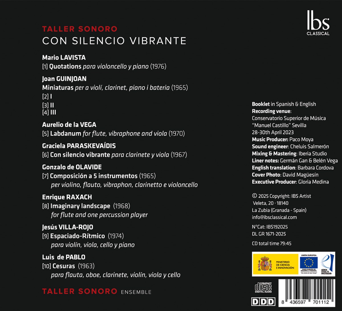 „Con silencio vibrante“ zeichnet ein fesselndes Porträt der spanischen und lateinamerikanischen musikalischen Avantgarde in einer ihrer kreativsten und transformativsten Phasen. Das Album, eingespielt vom renommierten Ensemble Taller Sonoro, vereint acht Kammermusikwerke, die zwischen 1963 und 1976 komponiert wurden, und bietet einen seltenen und aufschlussreichen Einblick in ein Repertoire, das bislang nur unzureichend dokumentiert ist. Die Aufnahme zeichnet ein dichtes Netz aus ästhetischen Ideen, persönlichen Verbindungen und transatlantischen Austauschprozessen nach, die die zeitgenössische Musik der Mitte des 20. Jahrhunderts geprägt haben. Serielle Strenge, kontrollierter Zufall, grafische Notation, literarische Inspiration und raffinierte Klangfarbenforschung koexistieren in Werken von Mario Lavista, Joan Guinjoan, Aurelio de la Vega, Graciela Paraskevaídis, Gonzalo de Olavide, Enrique Raxach, Jesús Villa-Rojo und Luis de Pablo – einige davon hier in der Weltpremiere. Von der zerbrechlichen Poesie in Lavistas „Quotations“ bis zur architektonischen Klarheit von De Pablo's „Cesuras“ offenbart das Album eine gemeinsame Suche nach neuen Ausdrucksmöglichkeiten, wobei die unverwechselbaren Stimmen jedes Komponisten erhalten bleiben. Stille, Textur, Rhythmus und Raum werden zu strukturellen Elementen einer Musik, die intellektuelle Strenge mit beeindruckender Ausdruckskraft in Einklang bringt. „Con silencio vibrante“ bestätigt Taller Sonoro als einen der führenden Interpreten des zeitgenössischen Repertoires und ist ein unverzichtbares Album für Hörer, die sich für das avantgardistische Erbe des 20. Jahrhunderts interessieren.