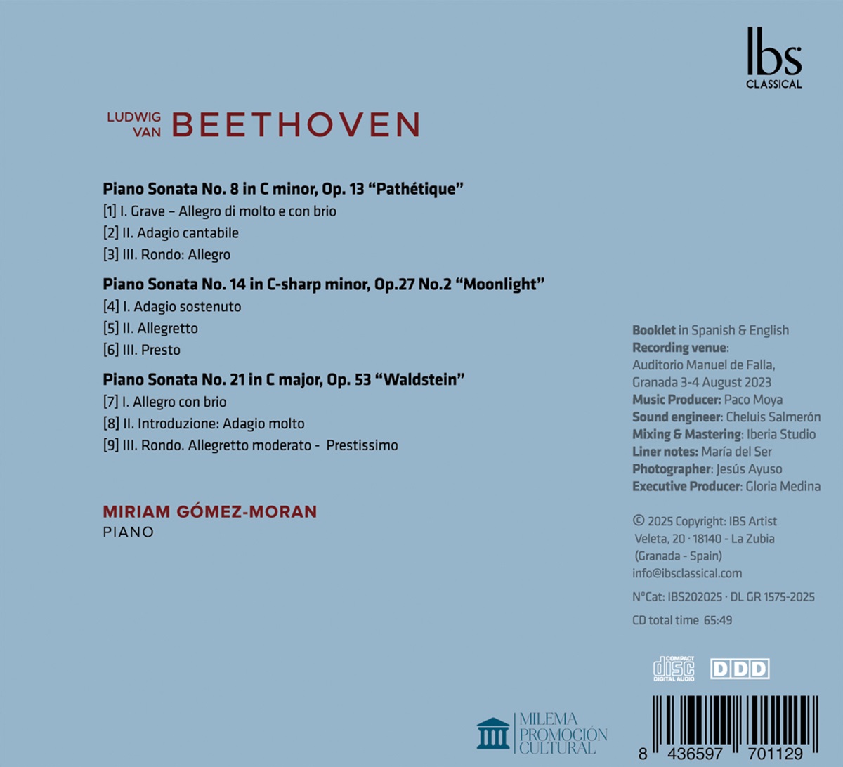 Nach ihrem vielbeachteten Album „Liszt: Années de Pèlerinage“ aus dem letzten Jahr kehrt die Pianistin Miriam Gómez-Morán mit einer neuen Aufnahme zurück, die drei der bekanntesten Klaviersonaten Ludwig van Beethovens gewidmet ist: „Pathétique“, „Mondscheinsonate“ und „Waldstein“. Das im Auditorio Manuel de Falla in Granada aufgenommene Album zeigt Gómez-Moráns ganzes Können. Ihre Interpretation hebt die dramatischen Kontraste, die strukturelle Klarheit und die Spiritualität hervor, die Beethovens pianistische Welt ausmachen. Von der kraftvollen Rhetorik der „Pathétique“ über die atmosphärische Mystik der „Mondscheinsonate“ bis hin zur strahlenden Virtuosität der „Waldstein-Sonate“ bietet Gómez-Morán eine Interpretation, die sowohl tiefgründig als auch fesselnd ist. Miriam Gómez-Morán wurde in Madrid geboren und studierte in Spanien, Budapest und Freiburg. Sie ist eine der vielseitigsten und angesehensten spanischen Pianistinnen der Gegenwart und kann auf eine internationale Konzertkarriere in Europa, Nordamerika und Asien zurückblicken. Ihre künstlerische Arbeit umfasst umfangreiche Forschungen zu historischen Tasteninstrumenten, Aufführungspraxis und dem Vermächtnis von Franz Liszt, dem Thema ihrer Doktorarbeit. Als Preisträgerin zahlreicher Wettbewerbe und gefragte Kammermusikerin ist sie derzeit Professorin für Klavier am Conservatorio Superior de Música de Castilla y León.