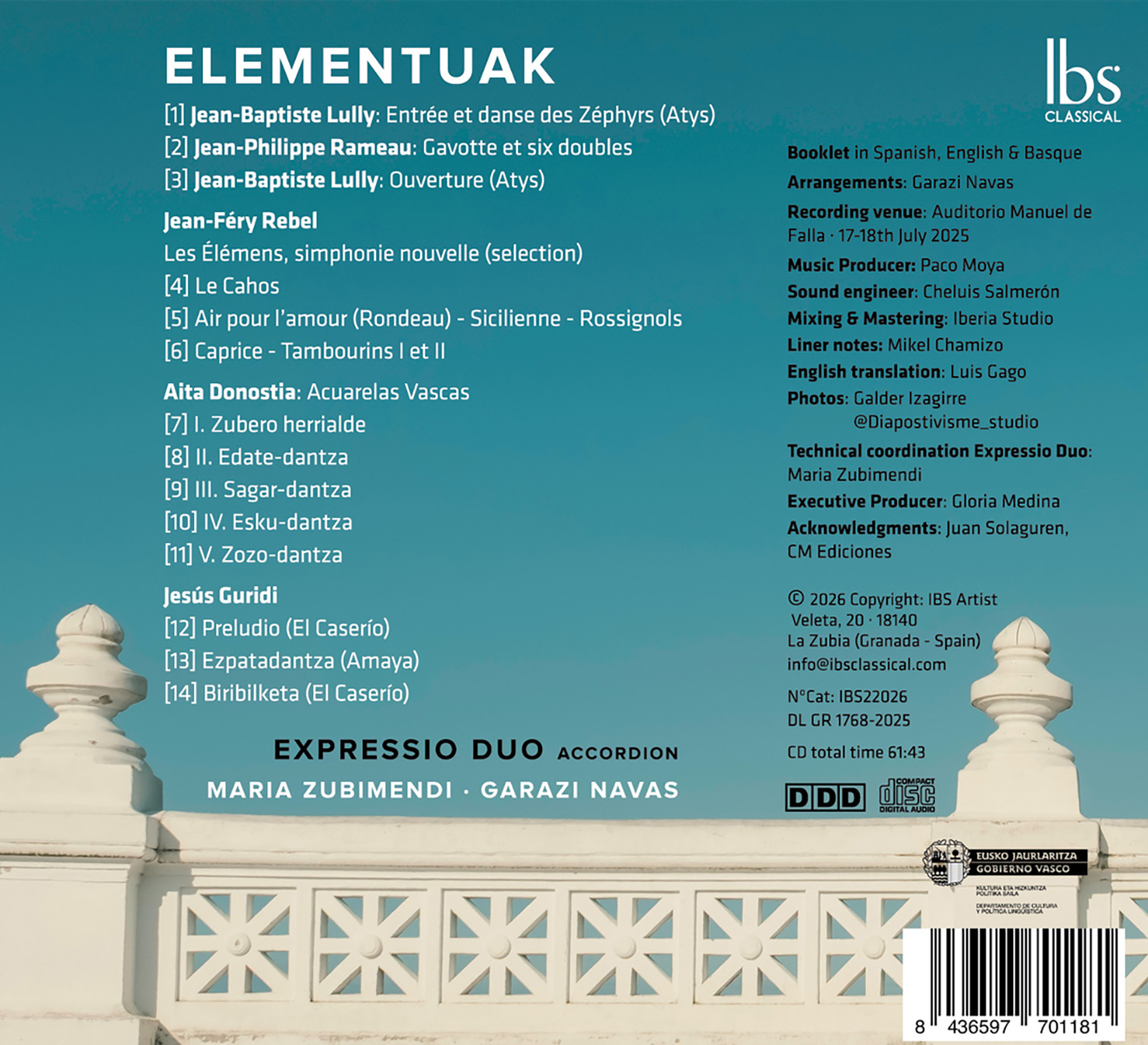 „Elementuak“ ist das Debütalbum von Expressio Duo, der baskischen Akkordeonpartnerschaft von Maria Zubimendi und Garazi Navas. Das Programm ist als eine Reise durch drei Jahrhunderte konzipiert und erforscht die Kunst der Transkription als kreativen Dialog zwischen Vergangenheit und Gegenwart, der die außergewöhnliche Ausdrucksvielfalt des modernen Akkordeons offenbart. Von der raffinierten Eleganz des französischen Barocks bis hin zur beschwörenden Klangwelt des baskischen Nationalismus des frühen 20. Jahrhunderts zeigt „Elementuak“ die Vielseitigkeit des Instruments in einem Repertoire, das ursprünglich für Orchester und Tasteninstrumente konzipiert war. Werke von Jean-Baptiste Lully und Jean-Philippe Rameau entfalten sich mit Klarheit, Farbe und rhythmischer Vitalität, während Jean-Féry Rebels visionäres „Le Cahos“ aus „Les Élémens“ durch die reiche harmonische Textur und dynamische Kontrolle des Duos eine auffallend moderne Intensität erhält. Das Programm schließt mit Musik, die in der baskischen Identität verwurzelt ist. Aita Donostias „Acuarelas Vascas“ beschwören mit impressionistischer Zartheit Landschaften und traditionelle Tänze herauf, und Auszüge aus Jesús Guridis „El Caserío“ und „Amaya“ zelebrieren folkloristische Energie, die sich in sinfonische Brillanz verwandelt. Diese Veröffentlichung, die im Auditorium Manuel de Falla in Granada aufgenommen wurde, bestätigt die künstlerische Tiefe des Expressio Duos und positioniert das Akkordeon als einen kraftvollen Vermittler zwischen Tradition und Neuerfindung in der heutigen klassischen Landschaft.