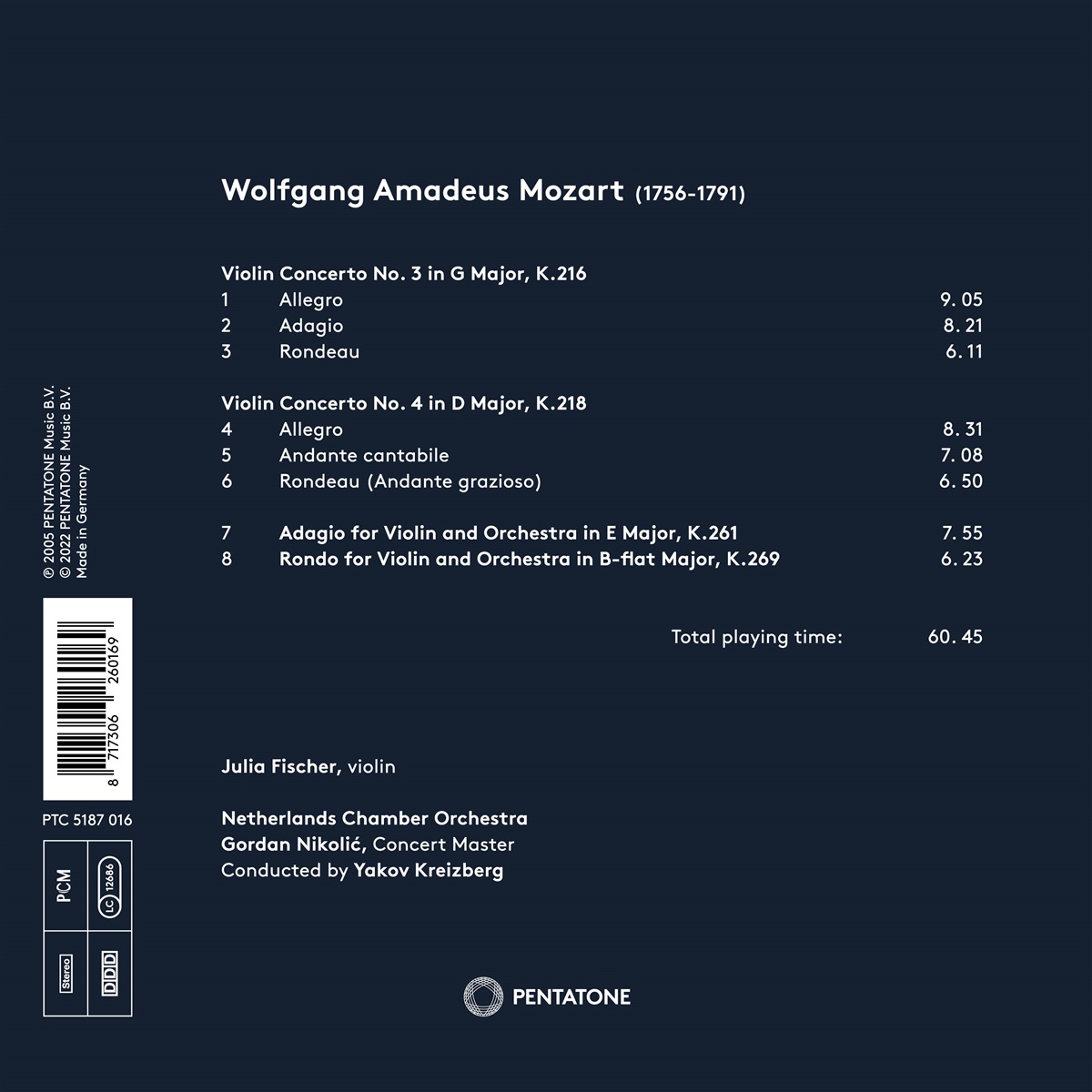 Pentatone legt Julia Fischers bahnbrechenden Aufnahmen der Violinkonzerte von W.A. Mozart neu auf, beginnend mit ihren Interpretationen des berühmten 3. und 4. Konzerts sowie des Adagios in E-Dur und des Rondos in B-Dur. Sie wurden 2005 erstmals veröffentlicht. Fischer spielte sie zusammen mit dem Netherlands Chamber Orchestra unter der Leitung von Yakov Kreizberg, mit dem sie eine sehr kongeniale Zusammenarbeit entwickelte. Bei der Erstveröffentlichung lobte das Gramophone Magazine die Aufführungen „voll disziplinierter Subtilität und erstaunlicher interpretatorischer Reife.“ Nachdem die Einspielungen lange vergriffen waren, kehren sie nun endlich als günstige CD-Fassung auf den Markt zurück.