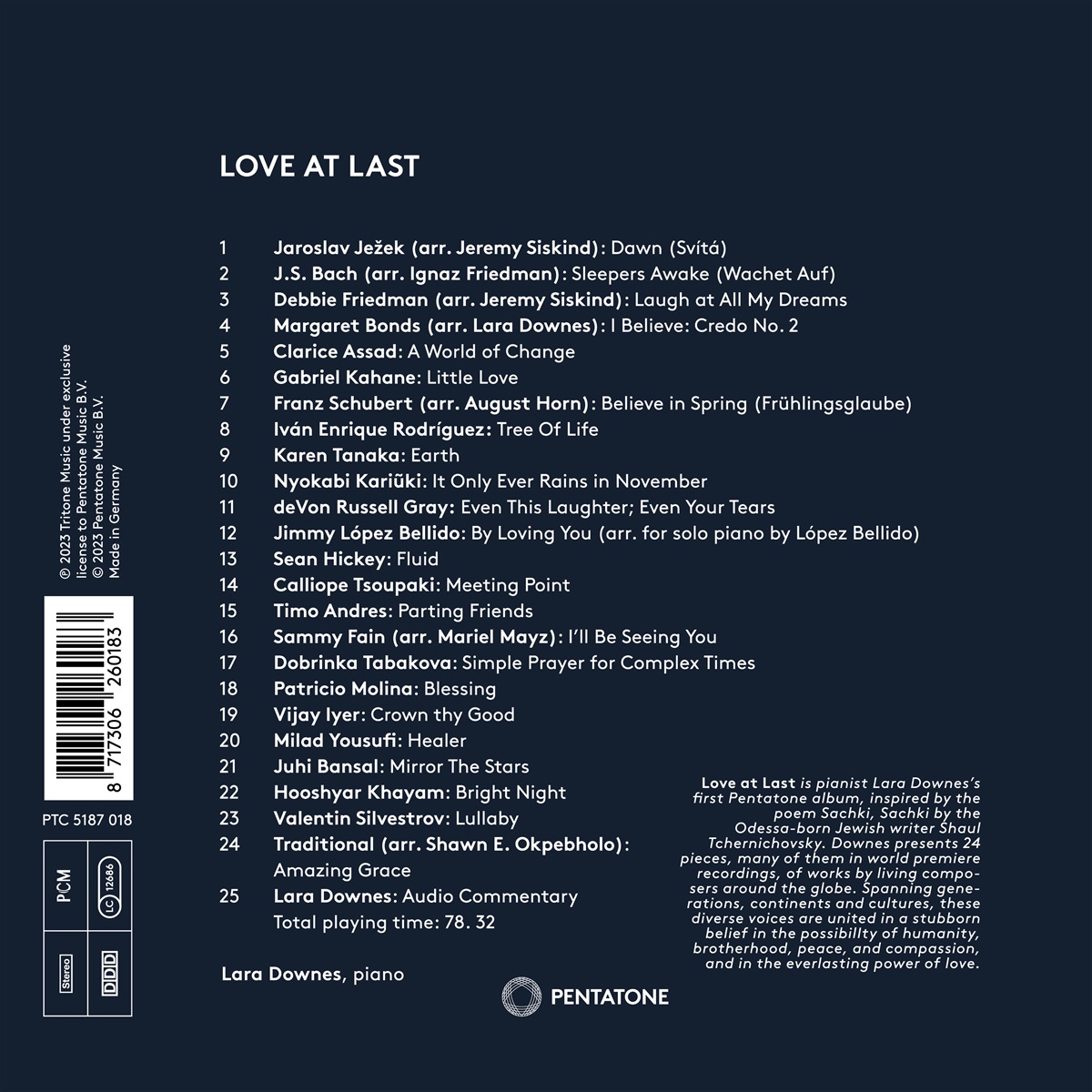 „Love at Last“ heißt das Pentatone-Debüt der US-amerikanischen Pianistin (und P. O. C. Aktivistin) Lara Downes. Inspiriert wurde es vom Gedicht „Sachki, Sachki“ (zu Deutsch „Lach nur über meine Träume“) des in der heutigen Ukraine geborenen hebräischen Dichters Saul Tschernichowski. Downes hat für ihr Album 24 kurze Stücke hauptsächlich zeitgenössischer Komponisten und Komponistinnen zusammengestellt. Viele davon erklingen als Weltersteinspielung. Die Werke aus allen Winkeln der Erde sind verbunden von der Idee und der Hoffnung auf ein weltweites Leben in Frieden, Brüderlichkeit, Würde und Menschlichkeit.