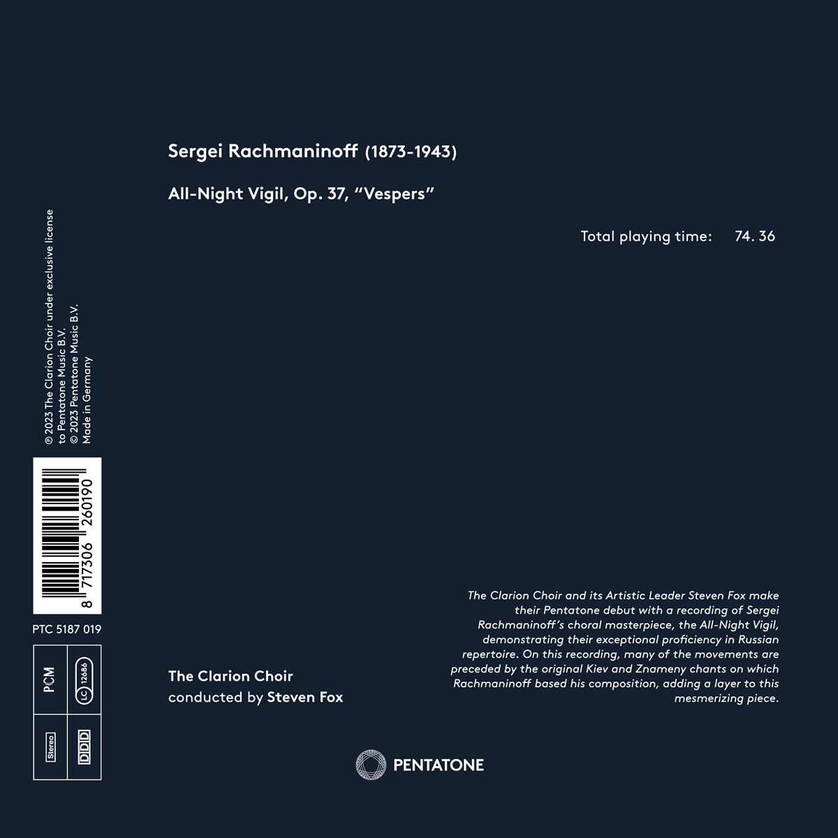 Der Clarion Choir und sein Leiter Steven Fox zeigen ihre Kunstfertigkeit bezüglich des russischen Repertoires mit einer Aufnahme von Sergei Rachmaninows Meisterwerk „Ganznächtliche Vesper“. Es handelt sich um einen Hymnus, der nachts begonnen wird und bis zum Morgengrauen andauert und auf diese Weise die Auferstehung Jesus symbolisiert. Die Botschaft von Licht und Hoffnung, die aus der Dunkelheit strahlt, ist sowohl universell als auch für jeweils aktuelle Ereignisse passend. Auf dieser Aufnahme geht vielen Sätzen der Original-Gesang aus Kiew oder der Snamennyj-Gesang voran, auf die Rachmaninow seine Komposition aufbaute – auf diese Weise erhält das hypnotisierende Werk eine weitere Facette.