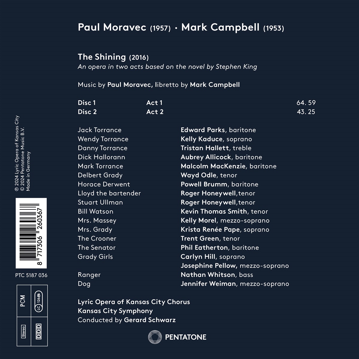 Aus Kansas City kommt die Weltpremiere von Paul Moravecs Oper „The Shining“. Die auf dem berühmten Roman von Stephen King basierende Oper wandelt die Geschichte dank der suggestiven Musik und Mark Campbells raffiniertem Libretto von einer Horrorstory zu einem menschlichen Drama. Nachdem die szenischen Aufführungen von Kritik und Publikum gleichermaßen gefeiert wurden, ist nun zum ersten Mal eine Aufnahme dieses fesselnden Werkes erhältlich. Das Kansas City Symphony und der Chor der Lyric Opera unter der Leitung des Dirigenten Gerard Schwarz arbeiten mit einer exzellenten Solistenbesetzung zusammen.
