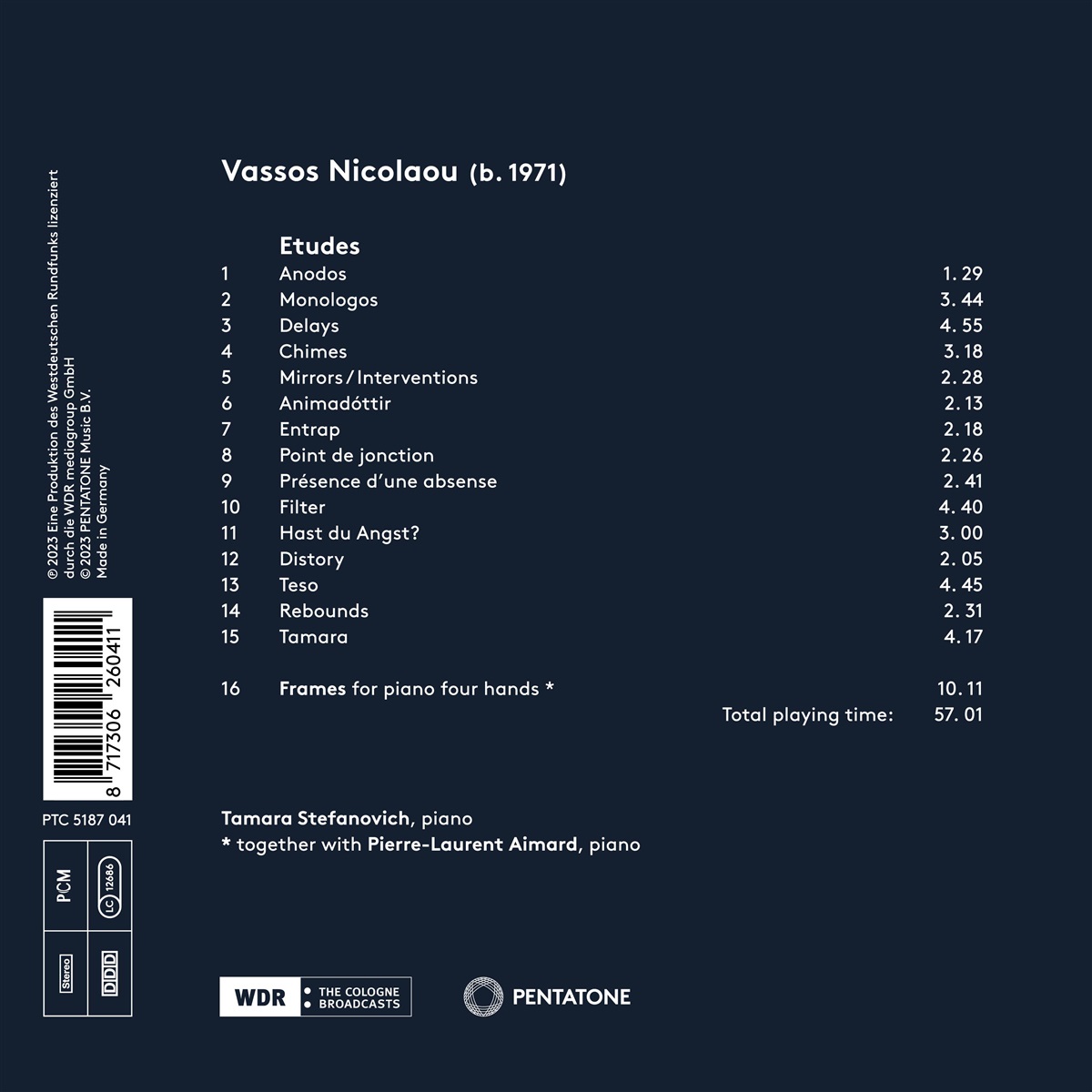 Die Pianistin Tamara Stefanovich präsentiert auf „Etudes & Frames“ Werke des zeitgenössischen (in Köln lebenden) Komponisten Vassos Nicolaou. In seinen Etüden erforscht der zypriotischen Meister Formen aus komplexen Rhythmen, großer Geschwindigkeit und einem vielschichtigen Klang. Jede der 15 Etüden besitzt einen suggestiven Titel und bezieht sich auf bestimmte geometrisch-choreographische Bewegungen der Hände auf der Tastatur sowie eine klangliche Idee. Stefanovich, die Vergleiche mit Ligetis Etüden zieht, hat gemeinsam mit Nicolaou studiert und sich seither immer für seine Musik eingesetzt. Ein ganzes Album mit seinen Werken aufzunehmen sei schon lange ihr Traum gewesen. Die Pianistin hat außerdem „Frames“ für zwei Klaviere aufgenommen und wird dabei von Pierre-Laurent Aimard unterstützt.