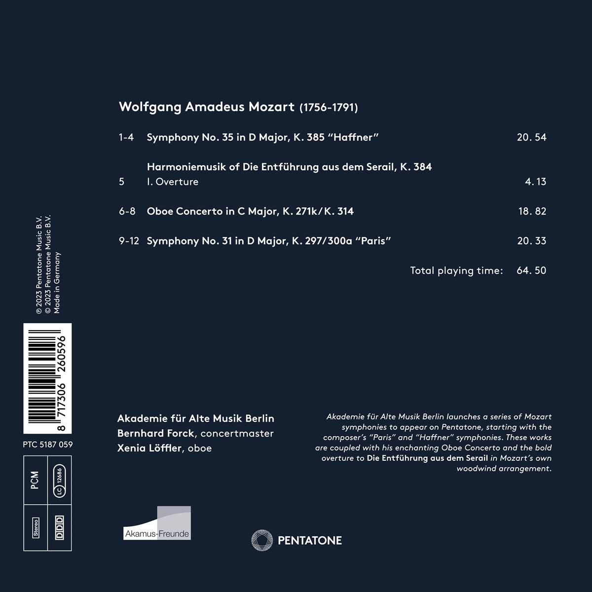 Dieses Album ist der erste Teil einer Reihe von Mozart-Sinfonien mit der Akademie für Alte Musik Berlin. Den Anfang machen die Pariser Sinfonie (Nr. 31) und die Haffner-Sinfonie (Nr. 35). Sie werden ergänzt durch das zauberhafte Oboenkonzert, das von der ersten Oboistin des Ensembles, Xenia Löffler, gespielt wird sowie durch die schwungvolle Ouvertüre zu „Die Entführung aus dem Serail“ in Mozarts Arrangement für Holzbläser. Zusammengenommen zeigen diese Stücke, wie vielfältig und ausdrucksvoll Mozarts Musik in der Periode zwischen 1777 und 1783 war: die Zeit, in der es ihm endlich gelang, ganz selbstständig zu werden und seine Heimat Salzburg zu verlassen.