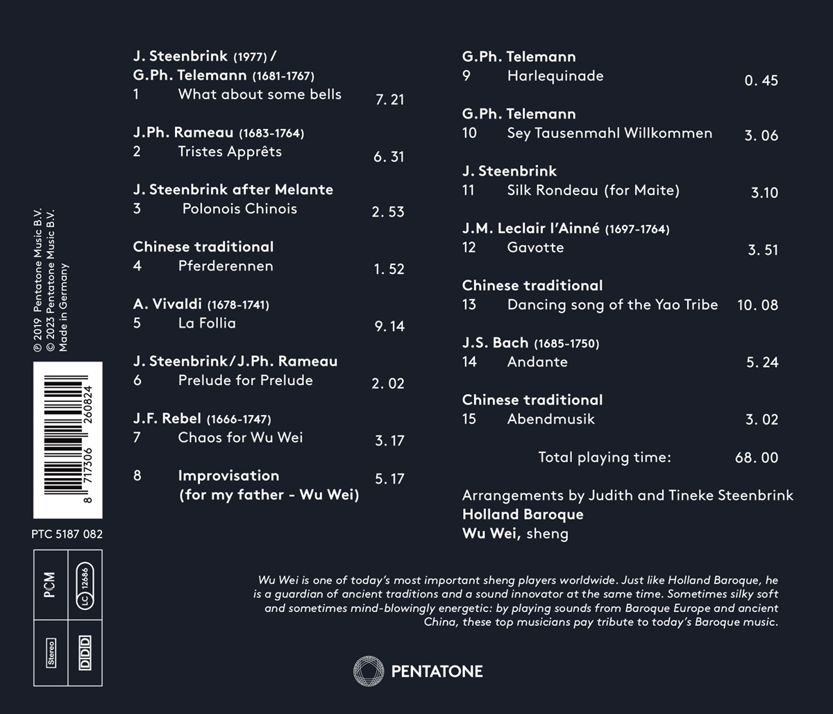 „Silk Baroque“ ist eine musikalische Begegnung zwischen dem chinesischen Musiker Wu Wei und Holland Baroque, die ein Programm eingespielt haben, das von Bach, Vivaldi, Telemann und Rameau bis zu traditionellen chinesischen Melodien reicht – alle verknüpft durch die Offenheit der Musiker, sich auf Improvisation, Experimente und Kulturaustausch einzulassen. Wu Wei spielt Sheng, eine ungewöhnliche chinesische Mundorgel, die wie ein Bündel Bambusrohre aussieht, die von Metallhüllen umgeben sind. Wu Wei führt die klangliche Vielfalt und rhythmischen Möglichkeiten der Sheng meisterhaft vor. Uralte Traditionen klingen in diesen Interpretationen frisch und fesselnd, die Zuhörer erfahren eine lebhafte, verführerische und faszinierende Klangwelt.