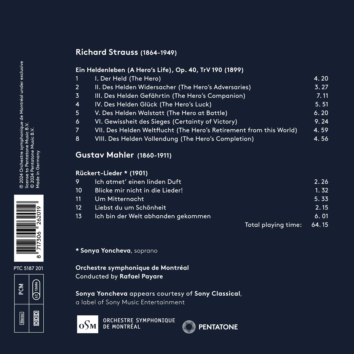Das Orchestre symphonique de Montréal und sein Musikdirektor Rafael Payare erweitern ihre Pentatone-Diskographie mit einer Aufnahme von Richard Strauss' „Ein Heldenleben“ und Gustav Mahlers „Rückert-Lieder“, letztere gesungen von Superstar-Sopranistin Sonya Yoncheva. Die Paarung der Werke mag auf den ersten Blick seltsam erscheinen, da die sinfonische Dichtung von Strauss überschwänglich und Mahlers Liedzyklus introvertiert ist. Es handelt sich jedoch um zutiefst persönliche und teilweise autobiografische Werke zweier Giganten der Fin-de-Siècle-Musik, die sich mit der Welt, in der sie lebten, und ihrem Platz darin auseinandersetzen.