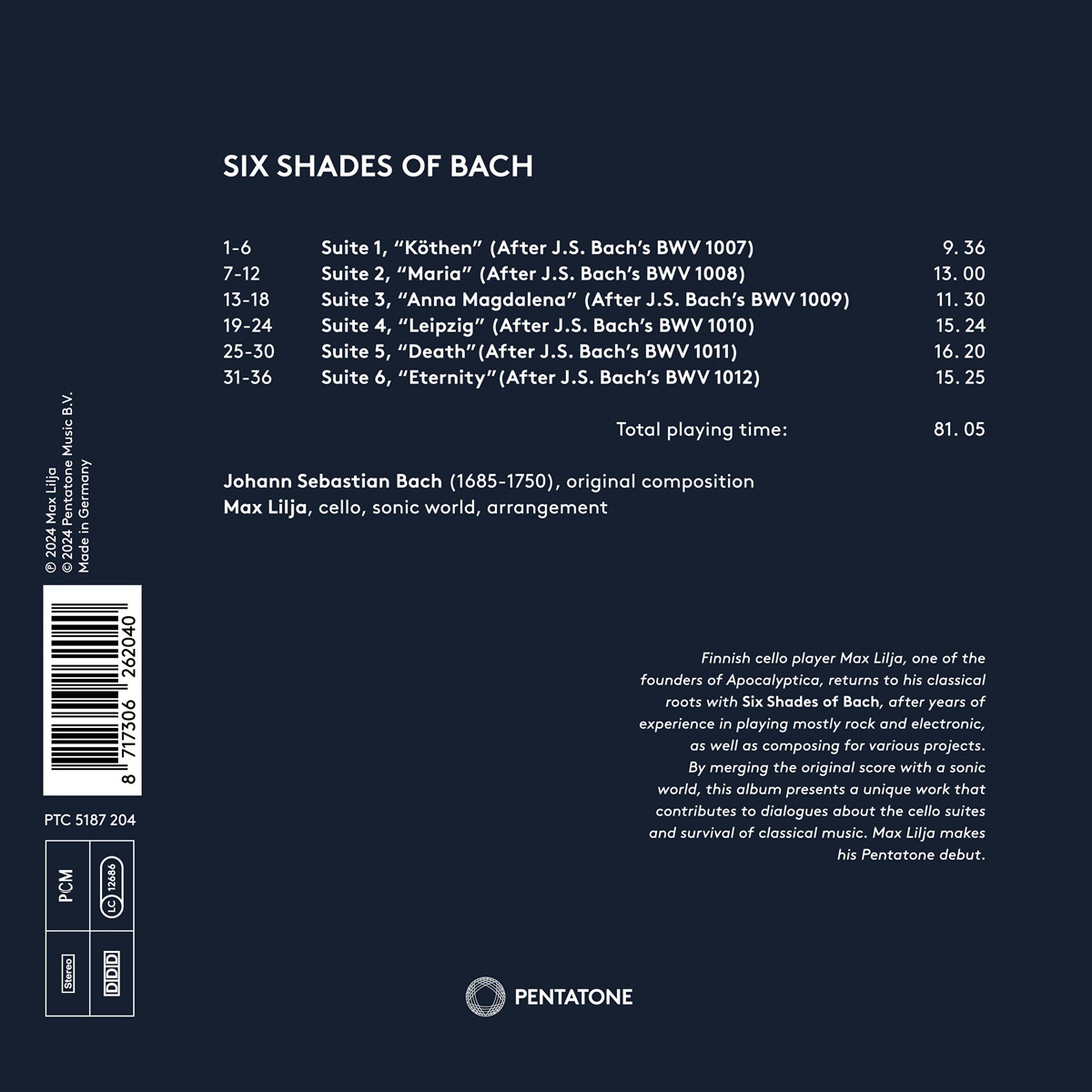 Der finnische Cellist Max Lilja, einer der Gründer des Cello-Rock-Quartetts Apocalyptica (!) hat auf „Six Shades“ Bachs Cellosuiten mit einer Ambient-Komposition verschmolzen. Lilja spielte dafür auf einem konventionelles Cello, dessen Sound er mit einer Reihe von Moog Effect Pedals verfremdete und bearbeitete. Den sechs Suiten hat er Stationen aus Bachs Leben – von Köthen bis in die Ewigkeit (!) – zugewiesen. Seine Interpretation ist inspiriert von Bachs rhythmischen Ideen, die sich von Suite zu Suite erweitern und im Laufe der Jahre immer komplexer und vielschichtiger werden. Parallel dazu entwickelt sich Liljas Spiel von der barocken Ordnung der ersten Suite bis hin zum fast romantischen Abschluss.