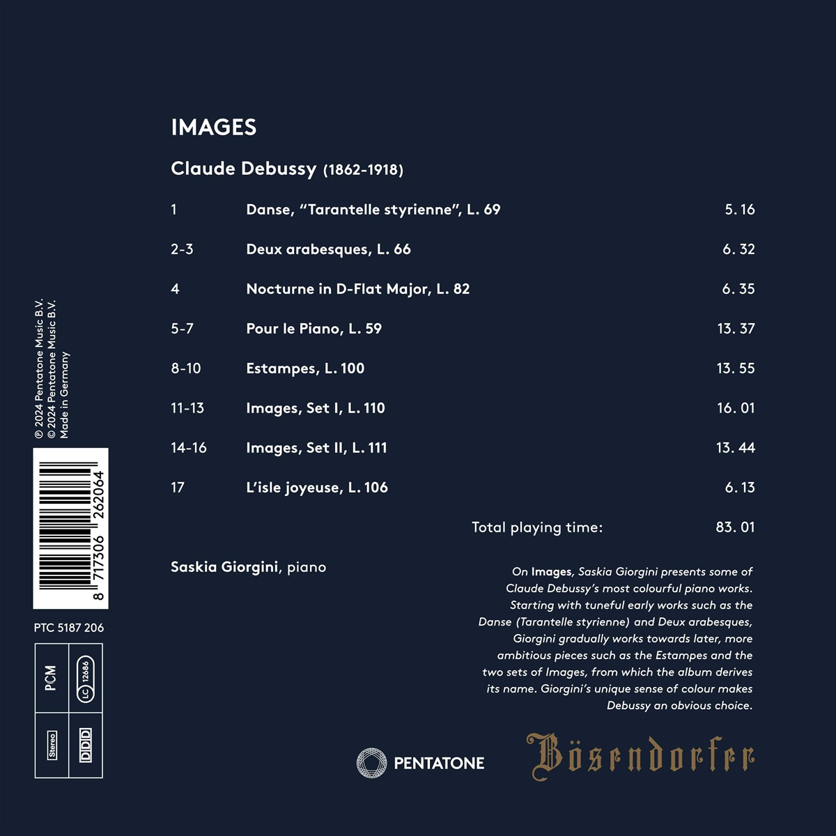 Auf dem Album „Images" präsentiert die italienische Pianistin Saskia Giorgini einige der farbenreichsten Klavierwerke von Claude Debussy. Beginnend mit melodiösen Frühwerken wie der „Danse (Tarantelle styrienne)“ und den „Deux arabesques“ arbeitet sich Giorgini allmählich zu späteren, anspruchsvolleren Stücken wie den „Estampes“ und den beiden „Images“-Sätzen vor, die dem Album den Namen geben. Die Musik Debussys hat auf Giorgini schon immer eine große Anziehungskraft ausgeübt, und dieses Album ist das Ergebnis einer jahrelangen Suche, diese faszinierenden musikalischen Bilder zum Leben zu erwecken.