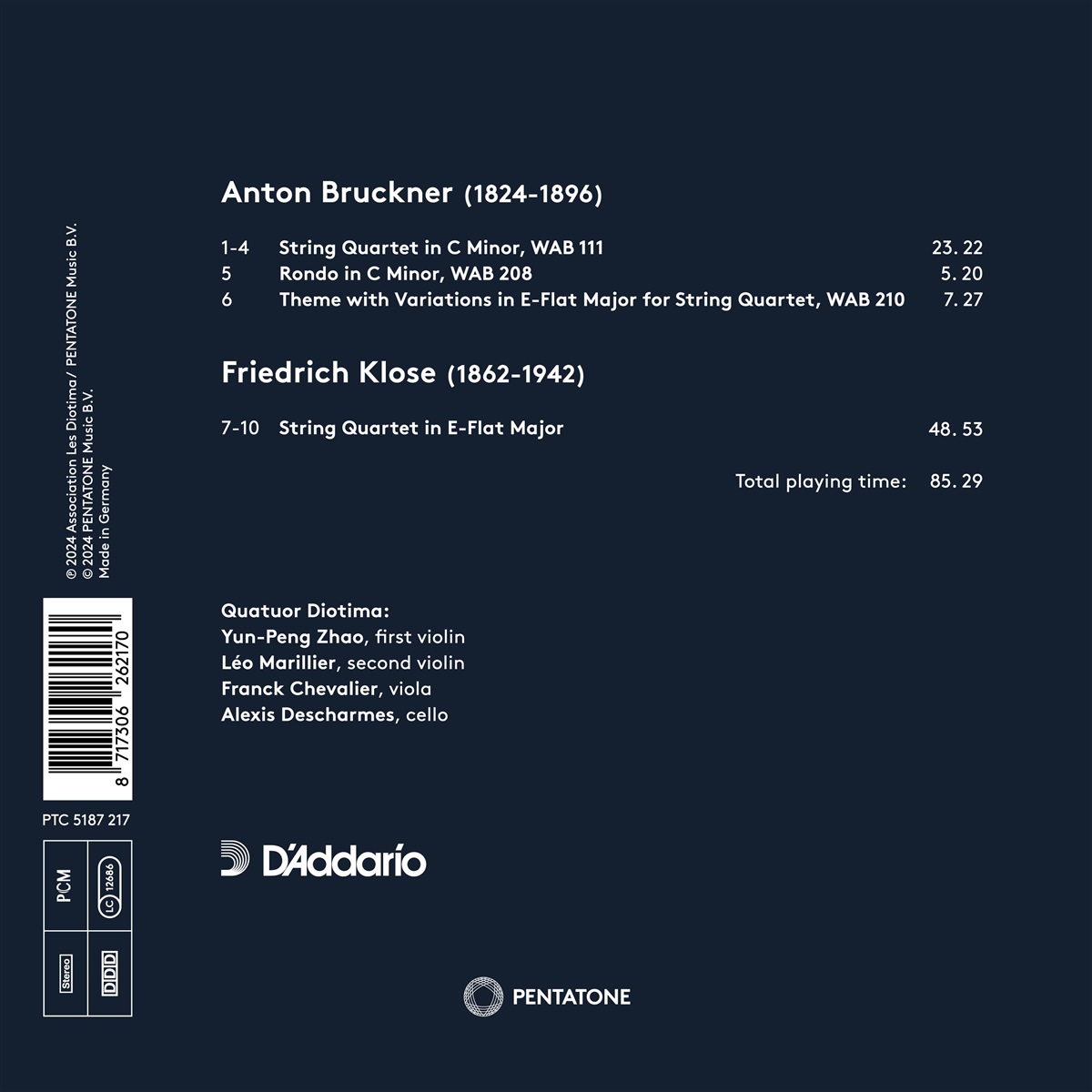 Das Quatuor Diotima feiert den zweihundertsten Geburtstag von Anton Bruckner mit einer Aufnahme seines Streichquartetts in c-Moll, des Rondos in c-Moll und des Themas mit Variationen in Es-Dur sowie des Streichquartetts in Es-Dur seines Schülers Friedrich Klose. Bruckner schrieb diese Stücke als Kompositionsübungen, doch sie lassen die Originalität und Kraft seiner späteren Werke erahnen und sind gleichzeitig eine Hommage an die glorreiche Wiener Quartetttradition. Das Quatuor Diotima ist heute eines der gefragtesten Kammermusikensembles der Welt und hat mit mehreren der größten Komponisten des späten 20. Jahrhunderts zusammengearbeitet.