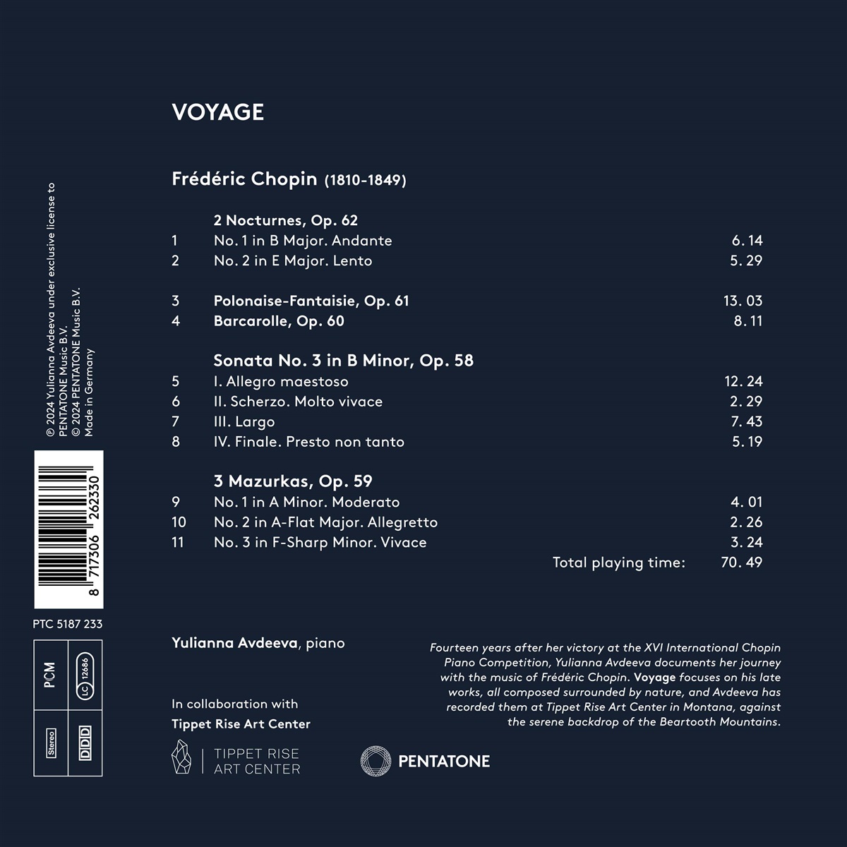 14 Jahre nach ihrem Sieg beim XVI. Internationalen Chopin-Klavierwettbewerb dokumentiert Yulianna Avdeeva ihre Reise mit der Musik von Frédéric Chopin. „Voyage“ konzentriert sich auf seine späten Werke, die alle inmitten der Natur komponiert wurden. Avdeeva hat sie im rustikalen Tippet Rise Art Center in Montana aufgenommen, vor der ruhigen Kulisse der Beartooth Mountains. Avdeeva ist eine Pianistin mit feurigem Temperament und Virtuosität, die mit ihrer Kraft, Überzeugung und Sensibilität ihr Publikum auf der ganzen Welt erobert hat. Nach ihrem gefeierten Labeldebüt mit „Resilience“ (2023) ist dieses intensive Chopin-Album ihre zweite Veröffentlichung auf Pentatone.