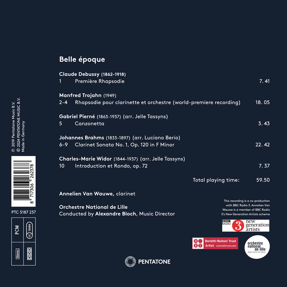 Die belgische Klarinettistin Annelien Van Wauwe debütierte 2019 mit dem Album „Belle époque“ erfolgreich, so erfolgreich, dass sie im darauffolgenden Jahr gleich einen Opus Klassik als „Nachwuchskünstlerin des Jahres“ gewinnen konnte. Kein Wunder, kombiniert das Album doch musikalische Delikatessen des französischen Fin de Siècle: Claude Debussys „Première Rhapsodie“, Gabriel Piernés „Canzonetta“ und Charles-Marie Widors „Introduction et Rondo“. Ergänzt wird das Album von der artverwandte Klarinettensonate Nr. 1, op. 120 von Johannes Brahms (arr. von Luciano Berio) und der Weltersteinspielung der „Rhapsodie pour clarinette et orchestre“ des zeitgenössischen deutschen Komponisten Manfred Trojahn. Die ursprüngliche SACD ist längst ausverkauft, nun werden die Aufnahmen als Stereo-CD endlich wiederveröffentlicht.