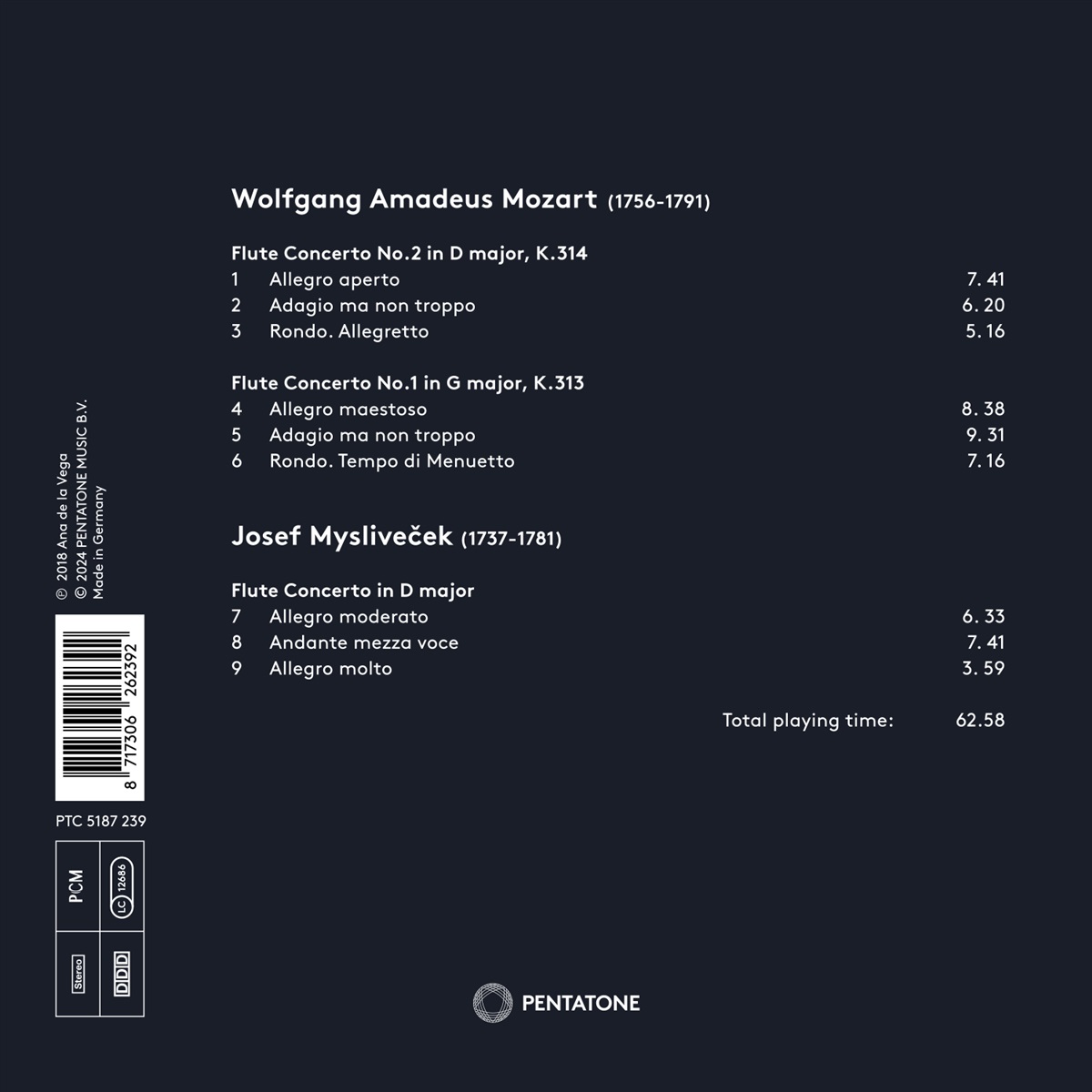 Flötistin Ana de la Vega feierte 2018 einen großen Erfolg mit ihrer Aufnahme der Flötenkonzerte von Wolfgang Amadeus Mozart und Josef Mysliveček. Dieses Album begründete ihre fulminante Karriere als die Flötistin von Weltrang schlechthin. Nun wird das längst vergriffene Album endlich wiederveröffentlicht. Mozarts Flötenkonzerte in G- und D-Dur mit ihren sinnlichen Melodien und großer Virtuosität gehören zu den beliebtesten Werken für das Instrument. Hier sind sie neben dem erst kürzlich wieder entdeckten Flötenkonzert in D-Dur von Mysliveček, einem böhmischen Zeitgenossen Mozarts, zu hören. Das English Chamber Orchestra steht der australischen Flötistin zur Seite.