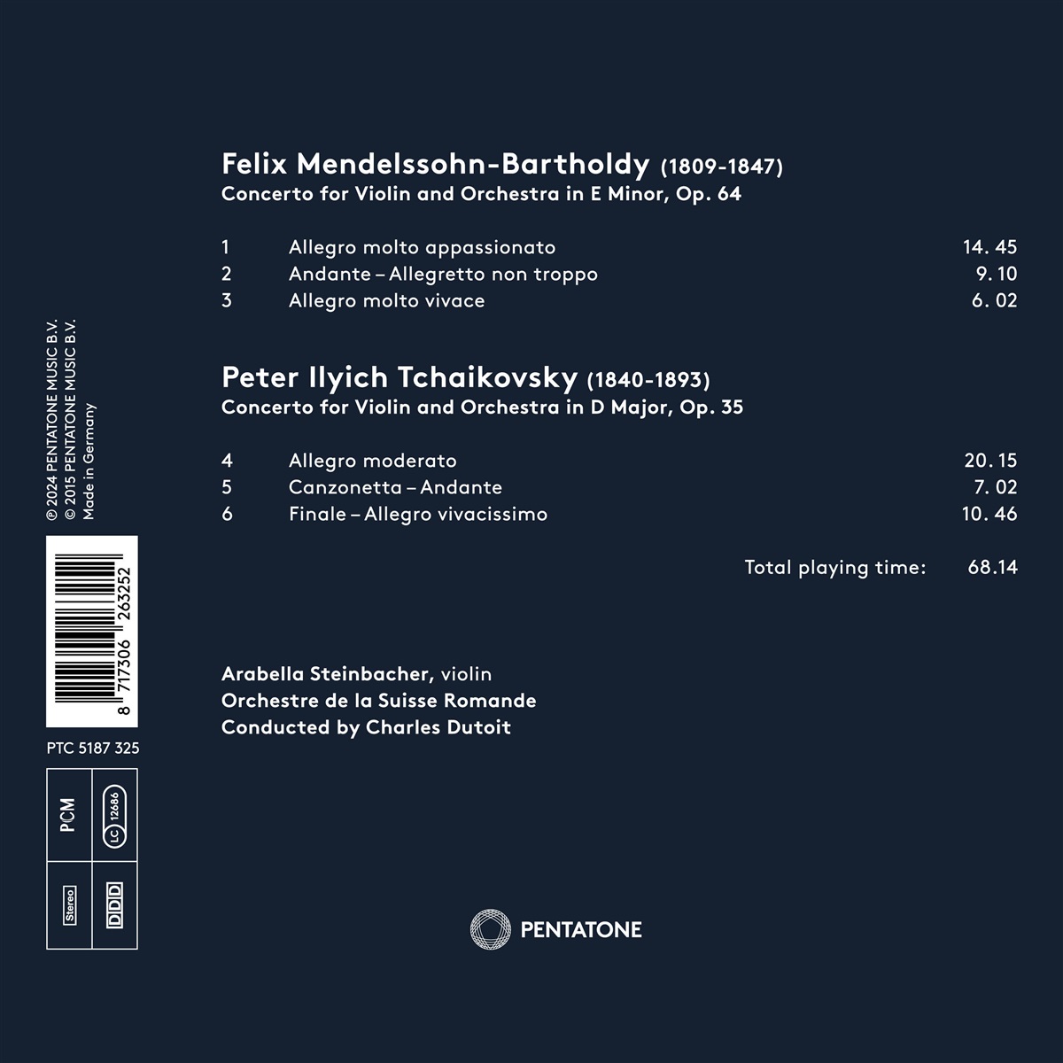 Neun Jahre nach der Erstveröffentlichung dieses Albums ist es nun wieder erhältlich: die Violinkonzerte von Pjotr Iljitsch Tschaikowski und Felix Mendelssohn mit Arabella Steinbacher. Die Geigerin und das Orchestre de la Suisse Romande spielen zwei Klassiker par excellence der romantischen Violinkonzert-Literatur. Mendelssohn führte in seiner Komposition einige Neuerungen ein und eine davon übernahm Tschaikowski für sein Konzert: Die Kadenz wird nicht erst am Ende des ersten Satzes gespielt, sondern bereits in der Durchführung. Es dirigiert der vielfach preisgekrönte Schweizer Dirigent Charles Dutoit, der 2014 den International Classical Music Award für sein Lebenswerk erhielt.