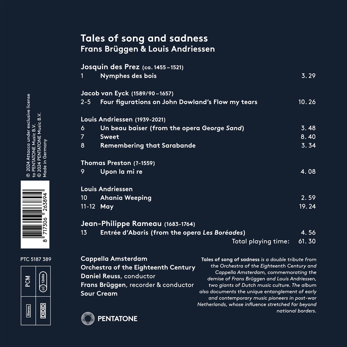 „Tales of song of sadness“ ist eine doppelte Hommage des Orchestra of the Eighteenth Century und der Cappella Amsterdam an Frans Brüggen und Louis Andriessen, zwei Giganten der niederländischen Musikkultur. Das Album dokumentiert auch die einzigartige Verflechtung von Pionieren der Alten und Neuen Musik in den Nachkriegsniederlanden, deren Einfluss weit über die Landesgrenzen hinausreicht. Im Mittelpunkt dieses Programms steht Andriessens „May“, das zum Gedenken an den Tod von Brüggen in Auftrag gegeben wurde und sich schließlich auch als Schwanengesang des Komponisten herausstellte. Es wird von anderen Werken Andriessens für Chor, Orchester und Blockflöte sowie Exkursen in die frühe Musik von Josquin des Prez, Thomas Preston, Jacob van Eyck und Jean-Philippe Rameau flankiert. Eine früheres Aufnahme von Cappella Amsterdam und Daniel Reuss, „In Umbra Mortis“, wurde mit dem Edison Klassiek Award ausgezeichnet.