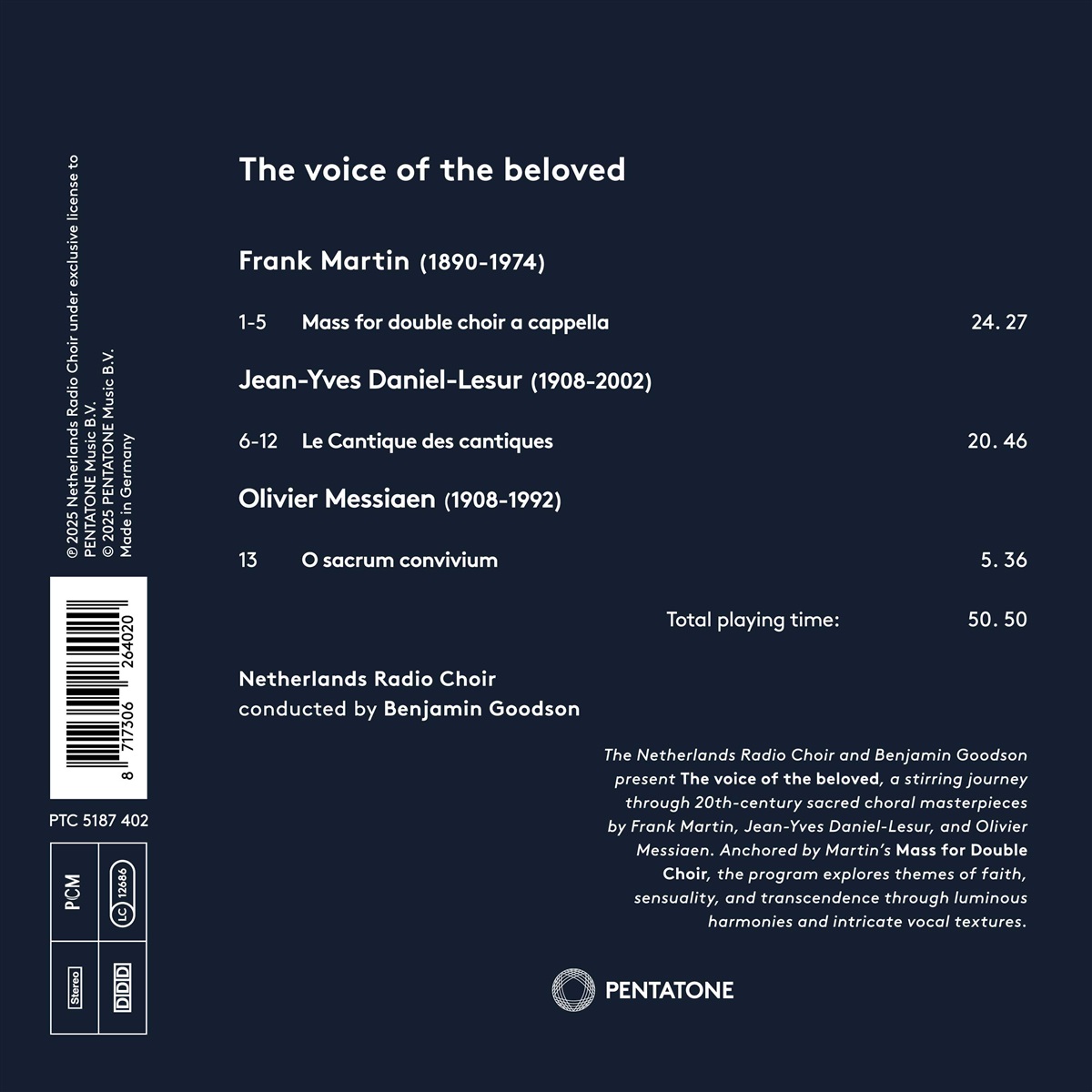 Der Niederländische Rundfunkchor und Benjamin Goodson präsentieren „The Voice of the Beloved“, eine beeindruckende Sammlung geistlicher Chorwerke aus dem 20. Jahrhundert von Frank Martin, Jean-Yves Daniel-Lesur und Olivier Messiaen. Im Mittelpunkt steht Martins „Messe für Doppelchor“, ein zutiefst persönlicher Ausdruck seines Glaubens, der 1922 komponiert und jahrzehntelang nicht veröffentlicht wurde. Ihre strenge Schönheit und strahlenden Harmonien machen sie zu einem der bewegendsten geistlichen Werke des letzten Jahrhunderts. Daniel-Lesurs „Le Cantique des cantiques“ verwandelt das Hohelied Salomos in einen sinnlichen und spirituellen Chor-Teppich, der bis zu zwölf Stimmen zu einer strahlenden Klanglandschaft verwebt. Messiaens „O sacrum convivium“, eine kurze, aber transzendente Motette, rundet das Programm ab. Nach der gefeierten Veröffentlichung „Rheinberger & Mendelssohn: Choral Works“ aus dem Jahr 2023 kehrt der Chor mit einer Aufnahme zurück, die das Heilige nicht nur im Gottesdienst, sondern auch in der rohen, ausdrucksstarken Kraft der menschlichen Stimme offenbart. Das übliche Repertoire des Niederländischen Rundfunkchors reicht von Romantik bis zur Gegenwart. Zeitgenössische Werke sind oft Auftragswerke niederländischer Komponisten wie Peter Wagemans, Bart Visman und Giel Vleggaar sowie Uraufführungen von Werken zeitgenössischer ausländischer Komponisten wie James MacMillan, Hans Werner Henze und John Adams. Darüber hinaus bilden ‚klassische‘ Komponisten des 20. Jahrhunderts wie Pierre Boulez, Karlheinz Stockhausen, Mauricio Kagel, György Ligeti und Olivier Messiaen einen wichtigen Teil des Repertoires, ebenso wie zeitgenössische Opern und Opern aus dem 19. Der Chor tritt in der Regel mit dem Radio Philharmonic Orchestra auf und arbeitet zudem seit langem mit dem Royal Concertgebouw Orchestra zusammen. Im Laufe der Jahre hat der Niederländischer Radio-Chor auch mit berühmten Dirigenten wie Bernard Haitink, Riccardo Chailly, Nikolaus Harnoncourt und Mariss Jansons zusammengearbeitet.