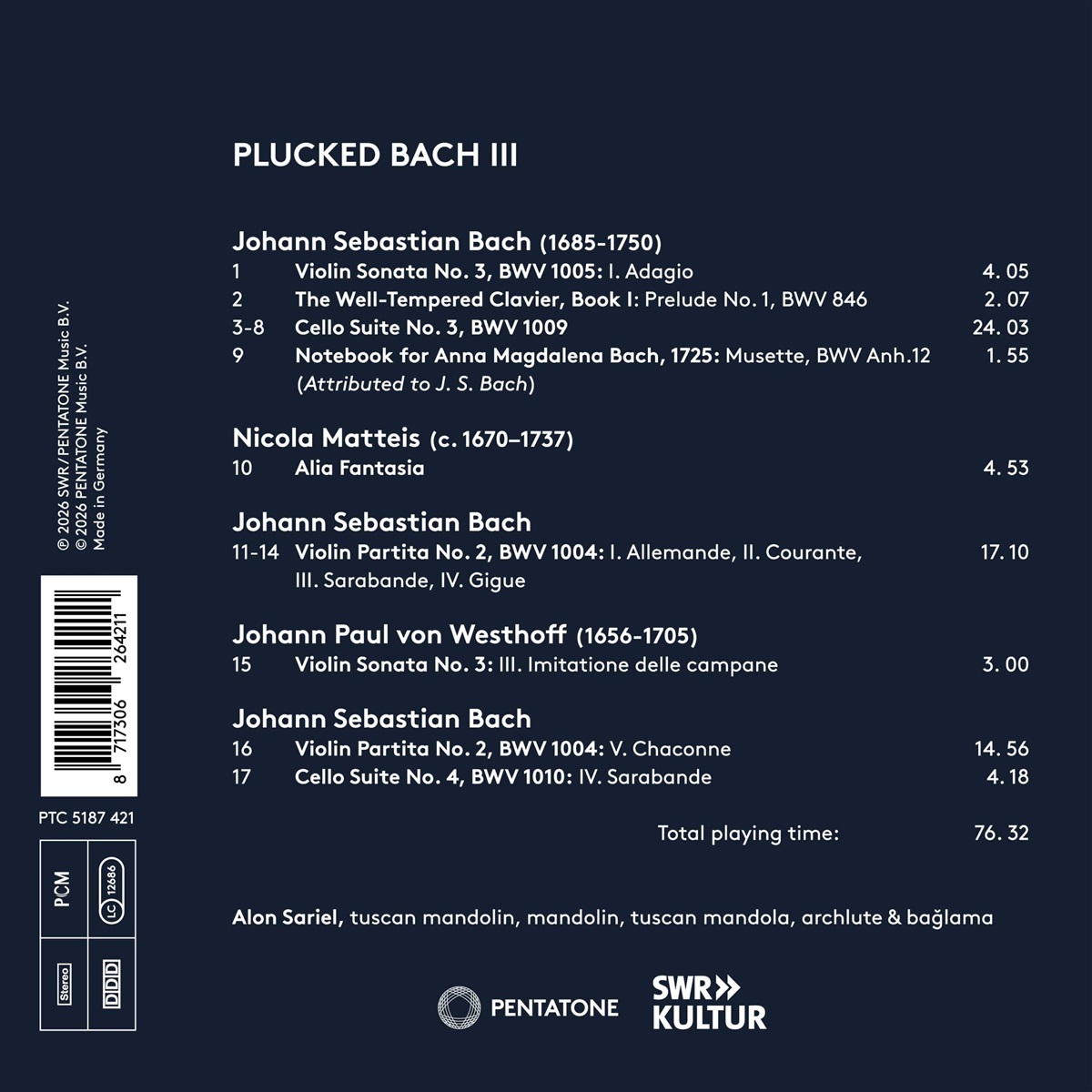 Mit „Plucked Bach III“ vertieft und beendet Alon Sariel seinen hochgelobten Bach-Zyklus und gestaltet eine Klangwelt, die sich durch außergewöhnliche Raffinesse und Innenbezug auszeichnet. Dieser abschließende Teil bereichert die Reihe um neue Farben: eine weitere Verwandte der Lautenfamilie - die osmanische Bağlama - und eine seltene Mandola toskanischer Bauart, deren um eine Oktave tiefere Stimmung Johann Sebastian Bachs dritter Cellosuite einen dunklen, samtigen Klang verleiht. Die Erzlaute, die am Anfang und am Ende des Albums zu hören ist, umrahmt das Programm mit ruhiger Eleganz. Sariels Spiel stellt heraus, dass Bachs Komposition sowohl architektonisch präzise als auch tiefgreifend taktil ist. Das Album entfaltet sich eher als eine Abfolge von fein ausbalancierten Reflexionen denn als ein einziger dramatischer Bogen. Bachs Werke - wie das Präludium aus dem „Wohltemperierten Klavier“, die „Musette“ aus dem „Notizbuch für Anna Magdalena“ und die Zweite Violinpartita mit ihrer monumentalen Chaconne - erscheinen in einem subtil veränderten Licht, ihr rhythmischer Puls und ihre harmonische Schwere werden durch die Intimität der gezupften Saiten deutlich hervorgehoben. Bekannte Stücke aus dem Keyboard-, Violin- und Cellorepertoire stehen neben selteneren Werken, darunter solchen von Westhoff und Matteis, und schaffen ein Hörerlebnis, das mühelos zwischen Kontemplation, Erinnerung und Resonanz gleitet.
