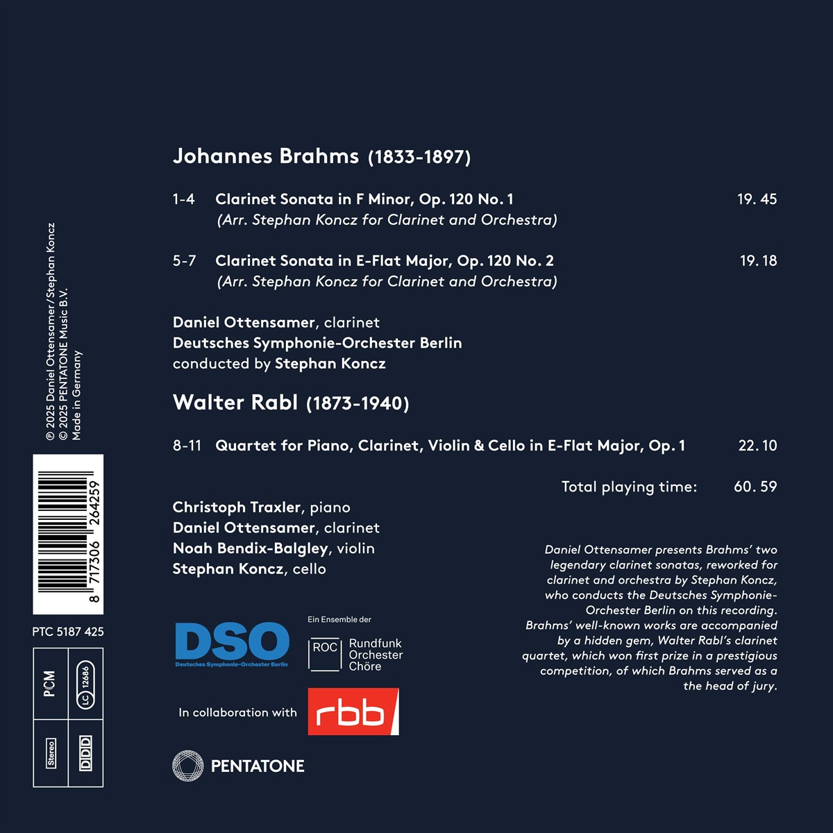 Daniel Ottensamer präsentiert die beiden legendären Klarinettensonaten von Brahms in einer Bearbeitung für Klarinette und Orchester von Stephan Koncz, der auf dieser Aufnahme auch das Deutsche Symphonie-Orchester Berlin dirigiert. Koncz' Orchestrierungen holen diese meisterhaften Stücke aus dem begrenzten Raum der Kammermusik heraus und lassen sie in einem neuen sinfonischen Licht erscheinen. Die Idee zu diesem sehr persönlichen Album begleitet die beiden schon seit ihrer Studienzeit, und nun ist endlich die Zeit gekommen, diese Vision in die Tat umzusetzen. Zu den bekannten Werken von Brahms gesellt sich ein verstecktes Juwel, das Klarinettenquartett von Walter Rabl, das bei einem renommierten Wettbewerb, dessen Jury-Chef Brahms selbst war, den ersten Preis gewann. Der Pianist Christoph Traxler und der erste Konzertmeister der Berliner Philharmoniker, Noah Bendix-Balgley, begleiten Ottensamer bei dieser Aufführung, während Koncz seinen Taktstock gegen das Cello tauscht. Die Kombination von Brahms und Rabl gibt dem Zuhörer einen faszinierenden Einblick in die reiche Musiklandschaft des späten 19. Jahrhunderts in Wien.