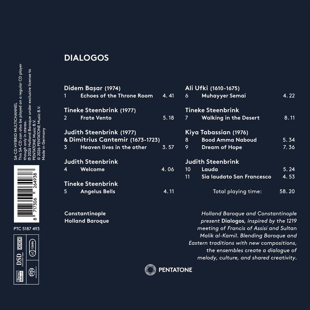 In „Dialogos“ begeben sich Holland Baroque und Constantinople auf eine musikalische Reise, die von einer der bemerkenswertesten Begegnungen der Geschichte inspiriert ist: dem Treffen zwischen dem Heiligen Franz von Assisi und Sultan Malik al-Kamil während des Fünften Kreuzzugs im Jahr 1219. Acht Jahrhunderte später wird ihre Geste der Offenheit zum kreativen Funken für diese Zusammenarbeit – ein Treffen nicht der Glaubensrichtungen oder Institutionen, sondern der menschlichen Stimmen und des gegenseitigen Respekts. Ausgehend von alten Quellen wie dem „Laudario di Cortona“ und den Werken des polnischen Musikers Ali Ufki (Wojciech Bobowski) aus dem 17. Jahrhundert spinnen die Ensembles neue Kompositionen, in denen persische, osmanische und frühe westliche Barocktraditionen miteinander verschmelzen. Unter der künstlerischen Leitung von Kiya Tabassian sowie Judith und Tineke Steenbrink wird die Musik zu einem lebendigen Dialog – einem Gespräch aus Klangfarben und Geschichten, das das Zuhören über die Spaltung und die Resonanz über den Konflikt stellt. Jede Note spiegelt eine Begegnung der Kulturen wider, in der das Alte das Neue inspiriert und in der Frieden im Klang beginnt. Bekannt für ihre kreative Neuinterpretation des Barockrepertoires und interkulturelle Begegnungen, leben sowohl Holland Baroque als auch das in Montreal ansässige Ensemble Constantinople von Zusammenarbeit und stilistischer Erkundung. Ihr Zusammentreffen in Dialogos setzt eine kreative Tradition fort, zu der auch die jüngsten Aufnahmen von Holland Baroque gehören: „Bachs Königin” und „Metamorphosis”.