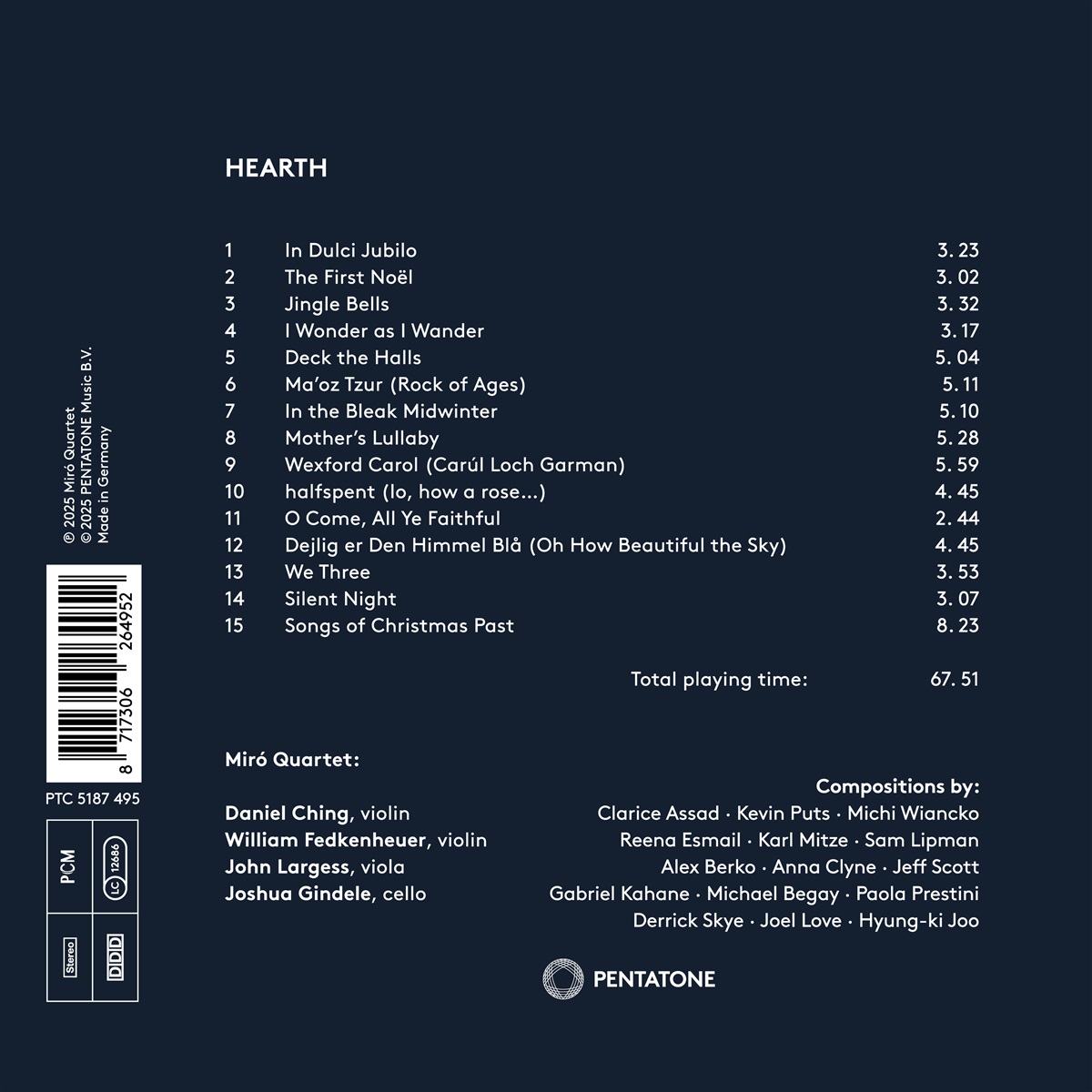 Das Miró Quartet lädt ein, sich um die Wärme des festlichen Kamins zu versammeln – ein sehr persönliches und freudiges Album, das den Geist der Weihnachtszeit durch die Stimmen der faszinierendsten Komponisten von heute zelebriert. Ob Weihnachten, Chanukka, Kwanzaa oder einfach nur die stille Besinnlichkeit am Kaminfeuer – dieses Album fängt die Essenz der Feiertage als Zeit der Verbundenheit, der Erinnerung und der Hoffnung ein. Mit Werken von Komponisten wie Anna Clyne, Clarice Assad, Gabriel Kahane, Reena Esmail und Paola Prestini ist jedes Stück ein musikalisches Andenken – eine fantasievolle Neuinterpretation eines vom Komponisten ausgewählten Weihnachtsliedes, das mit persönlicher Bedeutung erfüllt ist. Von Hymnen aus der Renaissance bis hin zu bekannten Weihnachtsliedern wie „Jingle Bells“ und von westafrikanischen Rhythmen bis hin zu zarter Streicherlyrik spiegelt diese lebendige Sammlung die reiche Vielfalt wider, mit der wir feiern, uns erinnern und zusammenkommen. „Hearth“ folgt auf die gefeierte Veröffentlichung „Ginastera String Quartets“ (2025) des Miró Quartetts, die als Gramophone Editor’s Choice ausgezeichnet wurde, zu den „5 Classical Music Albums You Can Listen to Right Now“ der New York Times zählt und den Pizzicato Supersonic Award bekamen. Ebenfalls erhältlich sind das für den Grammy nominierte „Home” (2024) und „Beethoven Complete String Quartets” (2021).