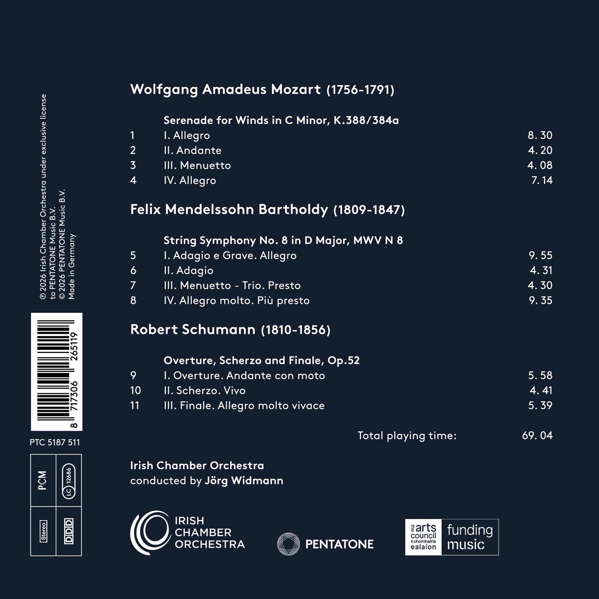 Dieses Album feiert eine bemerkenswerte zehnjährige kreative Partnerschaft zwischen dem Irish Chamber Orchestra und Jörg Widmann, der zwar mittlerweile neue Projekte verfolgt, aber weiterhin eng mit dem Ensemble verbunden bleibt. „Invitation“ fängt das Orchester in seiner ausdrucksstärksten Gestalt ein, von der spannungsgeladenen Intensität und kontrapunktischen Präzision von Wolfgang Amadeus Mozarts Serenade in c-Moll für Bläser bis hin zur beschwingten Energie und komplexen Textur von Felix Mendelssohns Streichersinfonie Nr. 8. Widmanns Dirigat bringt das reichhaltige Zusammenspiel der Stimmen, die lyrische Klarheit der Bläser und Streicher und die dynamischen Kontraste zur Geltung, die jedem Werk seinen unverwechselbaren Charakter verleihen. Das Album schließt mit Robert Schumanns „Ouvertüre, Scherzo und Finale“, das mit ansteckender rhythmischer Kraft und überschwänglicher Lyrik dargeboten wird. Das fein abgestimmte Zusammenspiel des ICO unterstreicht den spritzigen Dialog zwischen Streichern und Bläsern, während Widmann die schwungvollen Gesten und verspielten Kontraste des Werks mit Präzision und Vitalität gestaltet.