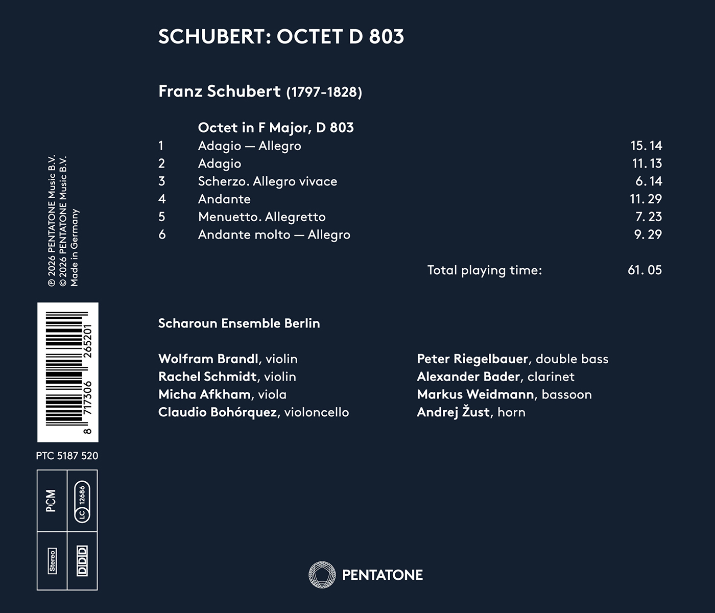 Franz Schuberts Oktett in F-Dur, D 803, gilt als eine der Krönungen der Kammermusik – eine weitläufige, sinfonische Vision, destilliert in acht Stimmen. Für das Scharoun Ensemble Berlin steht dieses Meisterwerk im Mittelpunkt seiner künstlerischen Identität. Das 1983 von Mitgliedern der Berliner Philharmoniker gegründete Ensemble ist nach Hans Scharoun benannt, dem Architekten der Berliner Philharmonie, deren Kammermusiksaal seit ihrem ersten öffentlichen Auftritt ihre musikalische Heimat ist – und auch Schauplatz dieser Aufnahme. Geprägt von jahrzehntelanger Vertrautheit offenbart das Oktett Schuberts gesamte Gefühlswelt: Freude und Überschwang, Zärtlichkeit und Nostalgie, Angst und Trotz.