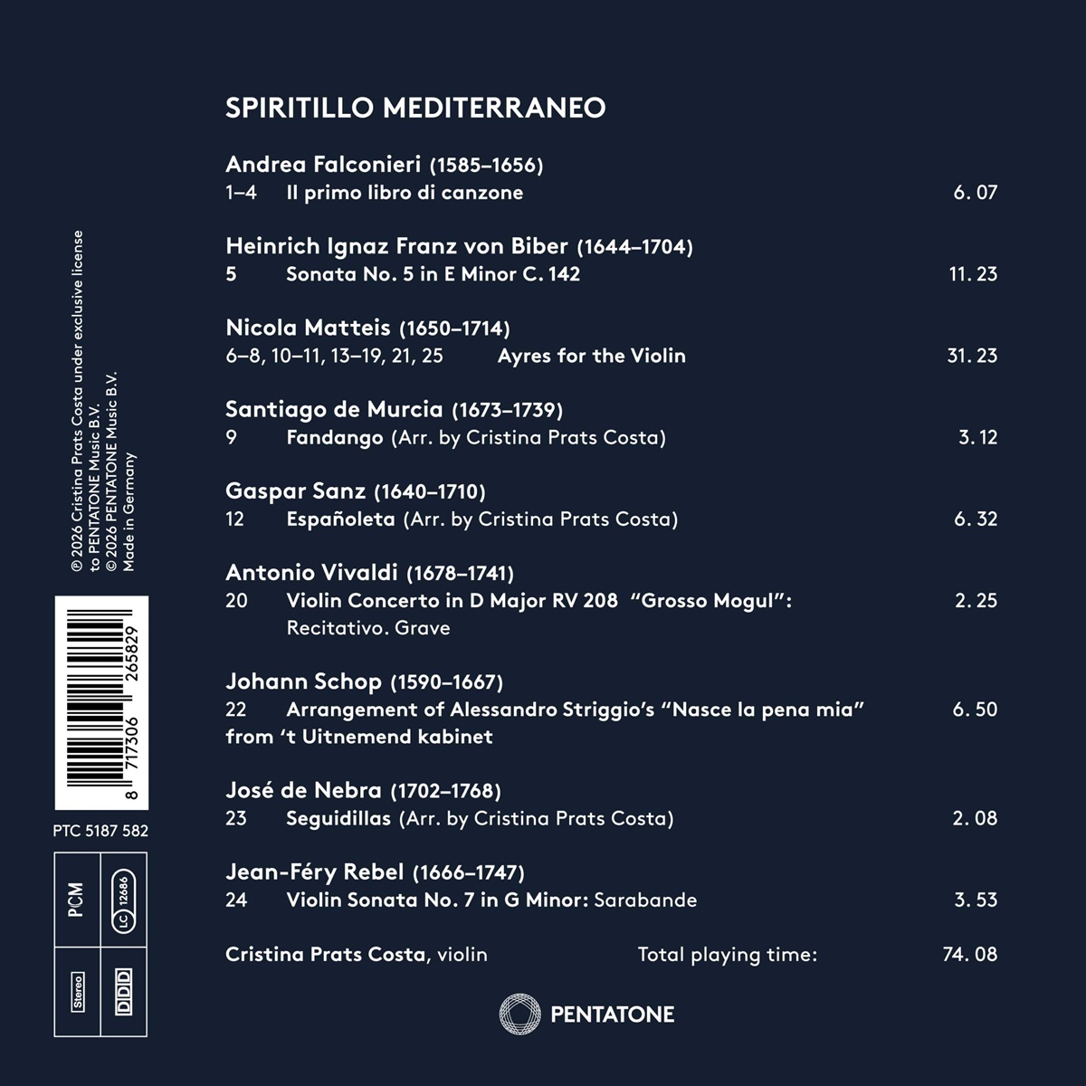 Die Geigerin Cristina Prats Costa debütiert mit ihrem Soloalbum „Spiritillo Mediterraneo“, einem lebendigen Porträt der Klangwelt der Musik des 17. und frühen 18. Jahrhunderts, die von den Kulturen des Mittelmeerraums geprägt ist. Inspiriert von Andrea Falconieris „Il Spiritillo Brando“, nimmt das Album den Spiritillo – einen schelmischen, animierenden Geist – als Metapher für die barocke Fantasie: ein Reich der Erfindung, der Improvisation und des reich verzierten Dialogs. Das Mittelmeer erscheint hier nicht als Grenze, sondern als Kreuzung, an der italienische Virtuosität, spanisches rhythmisches Feuer und französische Eleganz aufeinandertreffen. Musik von Andrea Falconieri, Nicola Matteis, Gaspar Sanz, Santiago de Murcia, José de Nebra, Heinrich Biber, Jean-Féry Rebel und Antonio Vivaldi spiegelt diesen Austausch wider, der durch die Verwendung von Kastagnetten, die eine unverwechselbare iberische rhythmische Vitalität beitragen, lebhaft gefärbt ist. Die spanischen Stücke erscheinen in Cristina Prats Costas eigenen Arrangements, und machen die musikalische Reise des Albums noch persönlicher. Spiritillo Mediterraneo" ist ein sehr persönliches Album, das auch Cristina Prats Costas eigenen künstlerischen Weg widerspiegelt. Verwurzelt in ihrem spanischen Erbe und geprägt von jahrelangen Auftritten in Europa, Nord- und Südamerika und Asien, stellt das Album die Ornamentik in den Mittelpunkt - nicht als Dekoration, sondern als Erzählung. Mit italienischer Brillanz, französischer Raffinesse und dem erdigen Puls spanischer Tanz- und Gitarrentraditionen vereinen diese Interpretationen historische Erkenntnisse mit einer individuellen Stimme. Das Ergebnis ist eine Aufnahme voller rhythmischer Energie, Intimität und Farbe, die von einem neugierigen, agilen und lebendigen Geist geleitet wird.