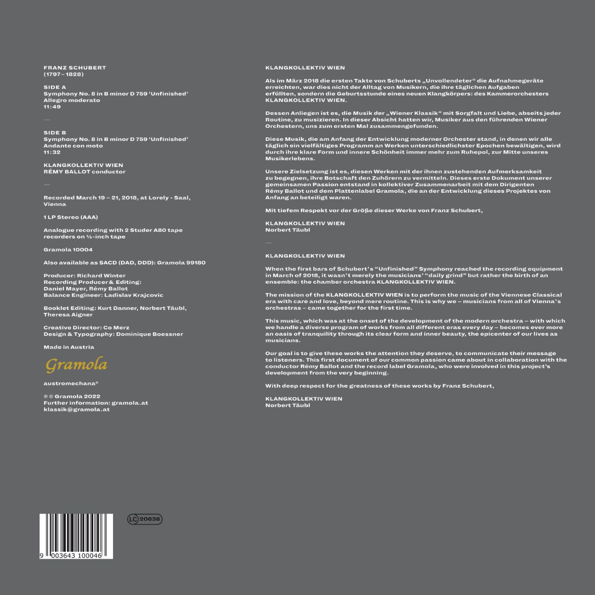 Als im März 2018 die ersten Takte Schubert die Aufnahmegeräte erreichten, war ein neuer Klangkörper, das Kammerorchester Klangkollektiv Wien geboren. Sein Anliegen ist es, die Musik der Wiener Klassik mit Sorgfalt und Liebe, abseits der Routine zu musizieren. Dafür finden sich seitdem regelmäßig ausgewählte Musiker und Musikerinnen der führenden Wiener Orchester zusammen. Nachdem 2018 die ersten Aufnahmen des Kollektivs (mit Schuberts Sinfonien Nr. 1 und 8) auf SACD und digital erschienen, folgt nun die „Geburtsstunde“ des Klangkollektivs auf Vinyl, Schuberts „Unvollendete“, als reine AAA-Produktion auf 45-rpm-LP.