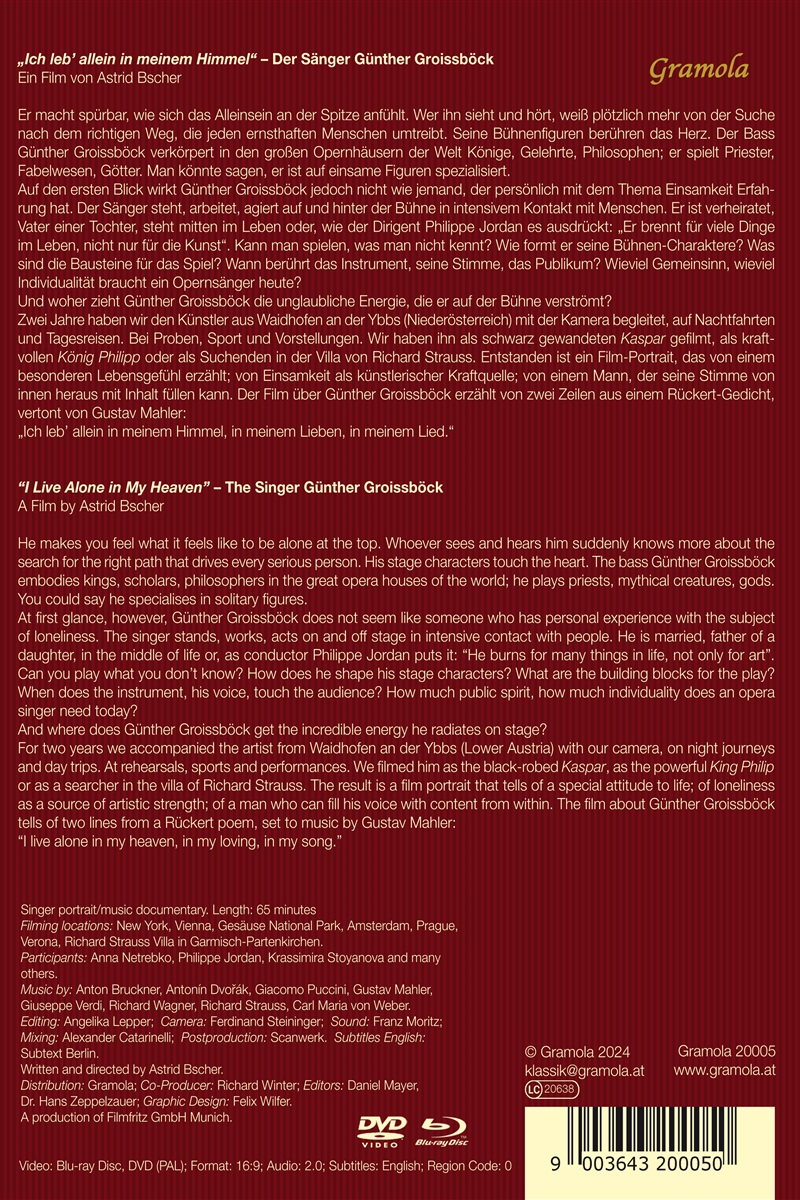 Der Bass Günther Groissböck verkörpert in den großen Opernhäusern der Welt Könige, Gelehrte, Philosophen; er spielt Priester, Fabelwesen, Götter. Man könnte sagen, er ist auf einsame Figuren spezialisiert. Auf den ersten Blick wirkt Günther Groissböck jedoch nicht wie jemand, der persönlich mit dem Thema Einsamkeit Erfahrung hat. Der Sänger steht, arbeitet, agiert auf und hinter der Bühne in intensivem Kontakt mit Menschen. Er ist verheiratet, Vater einer Tochter und steht mitten im Leben. Kann man spielen, was man nicht kennt? Wie formt er seine Bühnen-Charaktere? Was sind die Bausteine für das Spiel? Die Filmemacherin Astrid Bscher hat Günther Groissböck mit der Kamera begleitet, bei Proben, Sport und Vorstellungen. Entstanden ist ein Film-Portrait, das von einem besonderen Lebensgefühl erzählt, von Einsamkeit als künstlerischer Kraftquelle, von einem Sänger, der seine Stimme von innen heraus mit Inhalt füllen kann.