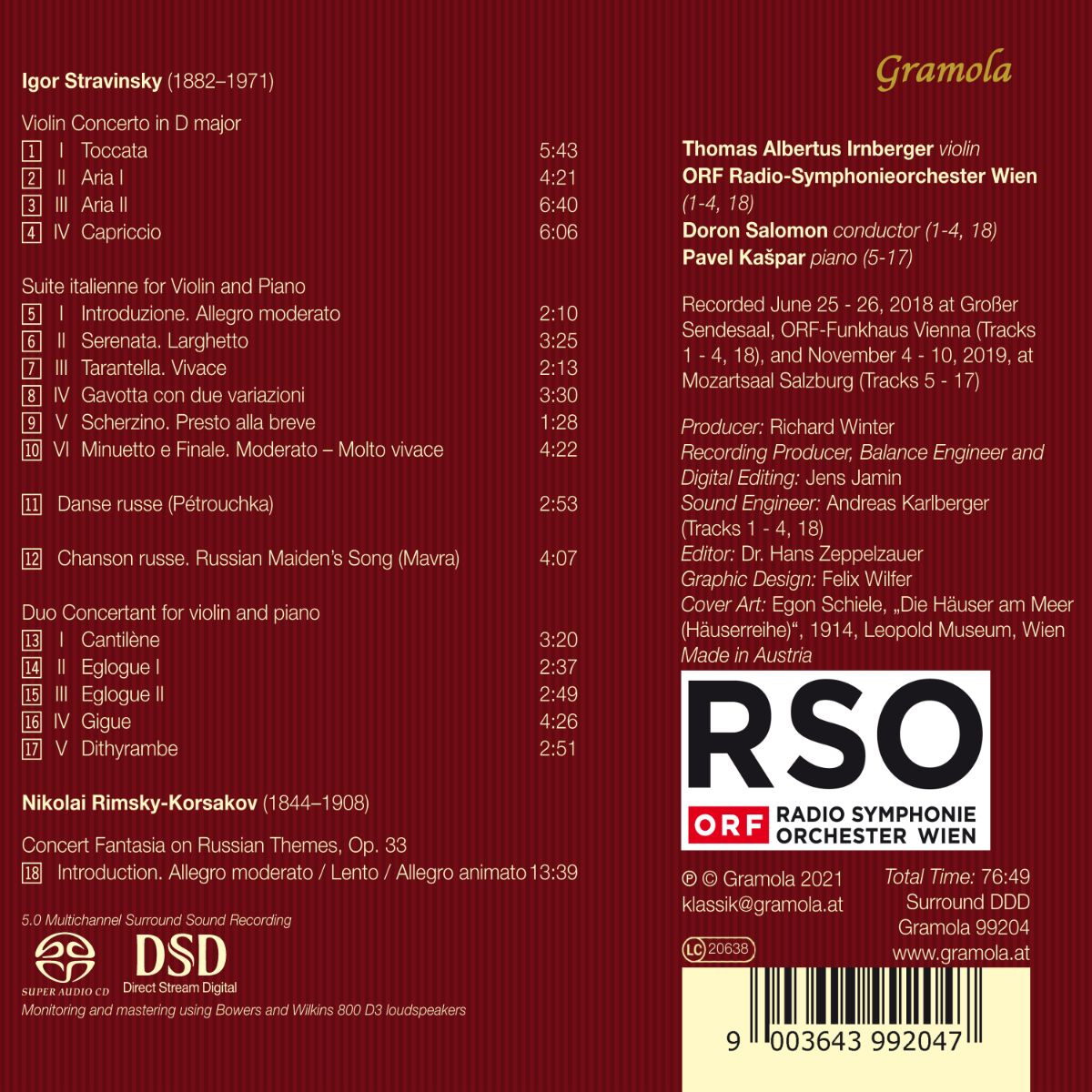 Für seine jüngste Einspielung mit dem Violinkonzert D-Dur von Igor Strawinsky konnte der vielseitige Violinist Thomas Albertus Irnberger wieder einmal einen Klangkörper von Weltrang gewinnen: das ORF-Radio-Symphonieorchester Wien unter der Leitung von Doron Salomon. Des Weiteren enthält das Album die Konzertfantasie über russische Themen h-Moll op. 33 von Strawinskys Lehrer, Nikolai Rimski-Korsakow. Gemeinsam mit dem Pianisten Paul Kašpar interpretiert Irnberger außerdem Strawinskys „Suite italienne“, das „Duo concertant“ für Violine und Klavier sowie die aus Bühnenwerken entlehnten „Danse russe“ (Petruschka) und „Chanson russe“ (Mavra).
