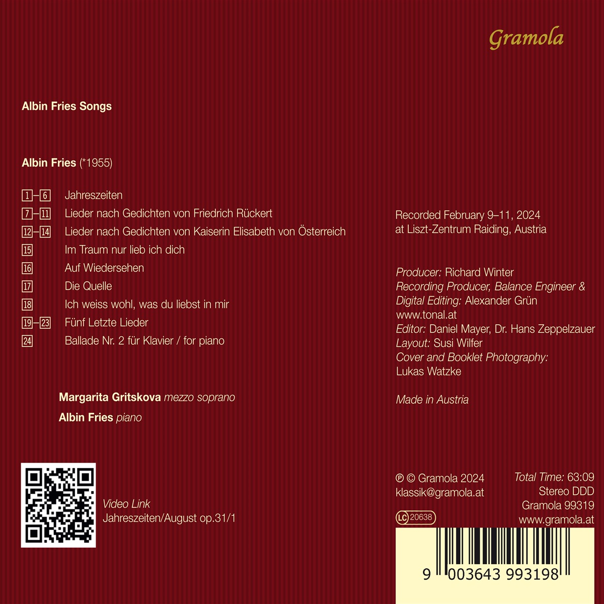 Albin Fries, der auch ein leidenschaftlicher Naturwissenschaftler ist, präsentiert auf diesem Album mit der Sopranistin Margarita Gritskova, die seit 2012 zum Ensemble der Wiener Staatsoper gehört, Höhepunkte seines Liedschaffens, das sich sehr auf die Tonsprache der Romantik bezieht. Dazu gehören Lieder, die sich auf die Natur beziehen, wie der Zyklus „Jahreszeiten“, der eine Vertonung von Uhlands berühmtem Gedicht „Frühlingsglaube“ enthält, sowie Musik zu Gedichten von Hermann Hesse, Stefan Zweig und Heinrich Seidel, Lieder, die der Liebe gewidmet sind, wie der Zyklus „Lieder nach Gedichten von Friedrich Rückert op. 52“ und Vertonungen anderer Gedichte von Adelbert von Chamisso und Clemens Brentano. Die ‚Fünf letzten Lieder op. 53‘ nach Gedichten von Theodor Storm und Edith Haider, die Margarita Gritskova gewidmet sind, entstanden unter dem Eindruck des Entschlusses des Komponisten, nicht mehr zu komponieren, was ihm aufgrund seines fortgeschrittenen Hörverlusts unmöglich geworden war.