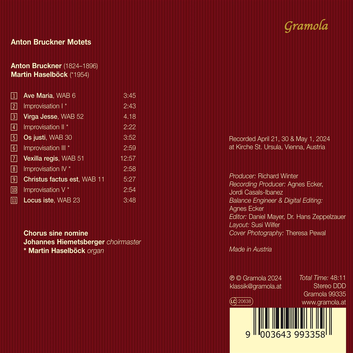 Der 1991 von Johannes Hiemetsberger gegründete Chorus sine nomine ist einer der profiliertesten und innovativsten Konzertchöre Österreichs. Auf diesem Album präsentiert der Chor Motetten von Anton Bruckner. Bruckner nannte sie schlicht ‚geistliche Chöre‘, da der Grund für ihre Komposition in der Regel auf einen liturgischen Anlass zurückzuführen ist. Die sechs Werke auf dem Album entsprechen solchen liturgischen Zwischenspielen: Graduale („Christus factus est“, „Locus iste“, „Os justi“, „Virga Jesse“), Offertorium („Ave Maria“) und ein Hymnus für die Karfreitagsliturgie („Vexilla regis“). Als Organist wurde Bruckner vor allem für seine Improvisationen bewundert. Besonders geschätzt wurde er zudem für seine hohen kontrapunktischen Fähigkeiten, in denen er sein handwerkliches Können in Fuge und Imitation unter Beweis stellte. Der Stil der fugierten Teile seiner Improvisationen basierte auf barocken Mustern (wie Händel), während in anderen, fantasievolleren Teilen die Tonsprache seines Orgelspiels immer Brucknertypischer wurde. Martin Haselböck stellt mit seinen Orgelimprovisationen diese Verbindung zu Bruckner her.