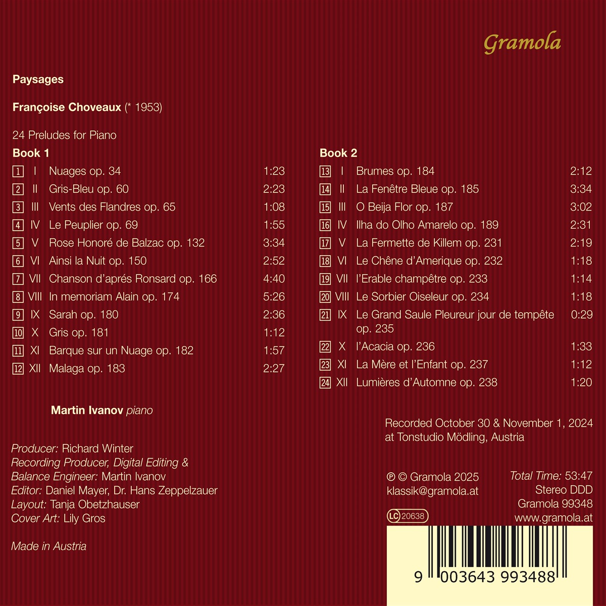 Françoise Choveaux ist Komponistin, aber auch Pianistin, und knüpft an eine bis ins 19. Jahrhundert reichende Musiktradition an. Nach ihrer Rückkehr von der Juilliard School in New York nach Frankreich im Jahr 1981 ließ sie sich in einem kleinen Bauernhaus in Killem nieder, umgeben von den windgepeitschten Feldern in Ostflandern. Die kraftvolle Natur und die weiten Landschaften sind ein wesentlicher Bestandteil ihres Lebens, und so ist jede ihrer Partituren entweder von Reisen oder inneren Emotionen inspiriert oder steht in direktem Zusammenhang mit einem literarischen oder bildnerischen Werk. Die von dem bulgarischen, in Wien lebenden Pianisten Martin Ivanov interpretierten 24 Préludes für Klavier mit dem Titel „Paysages“ (Landschaften) entstanden zwischen 1981 und 2024 und sind Liebeslieder an die Natur, inspiriert von den erdigen Elementen Flanderns; sie beschreibt den Himmel, der von starken, kontrastreichen Winden heimgesucht wird, den strahlenden Himmel, die schwarze, fruchtbare Erde. Die 24 Préludes sind aufgeteilt in zwei Bücher – in Anlehnung an die großen Vorgänger Claude Debussy, Johann Sebastian Bach oder Dmitri Schostakowitsch. und sie entstanden über einen Zeitraum von mehr als 40 Jahren. Martin Ivanov hat schon Werke von Franz Liszt, Frédéric Chopin und Robert Schumann aufgenommen.