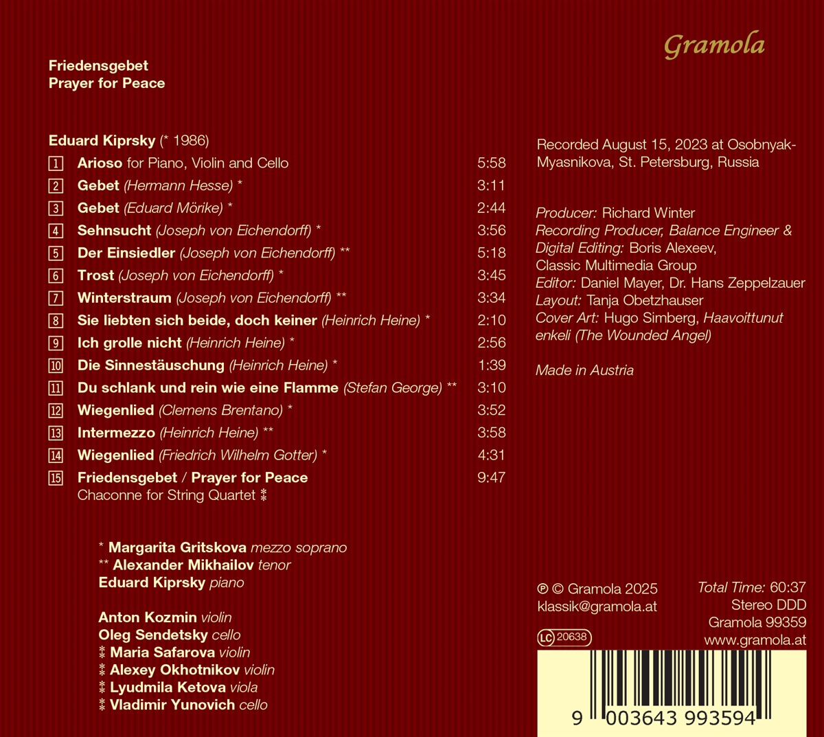 Der aus St. Petersburg stammende Pianist und Komponist Eduard Kiprsky wurde bereits mit unzähligen internationalen Kompositionspreisen ausgezeichnet. Seine Beschäftigung mit dem Kunstlied nimmt dabei seit jeher eine zentrale Stellung ein. Die Mezzosopranistin Margarita Gritskova, Ensemblemitglied und Publikumsliebling der Wiener Staatsoper, und Alexander Mikhailov, Tenor am Mariinsky Theater St. Petersburg, präsentieren mit dem Komponisten am Klavier auf dieser CD unter dem Titel „Friedensgebet“ Lieder aus seinen Liederzyklen von Dichtern wie Heinrich Heine, Eduard Mörike, Hermann Hesse, Joseph von Eichendorff oder Clemens Brentano mit Bezug zu Zweifel, Verlust und Leid, aber auch Liebe, Hoffnung und Zuversicht. Dazu gelangen als Umrahmung zwei Instrumentalwerke zu Gehör, nämlich das Arioso für Klavier, Geige und Cello sowie das preisgekrönte, titelgebende Streichquartett „Friedensgebet“. Eduard Kiprsky schreibt über seine Werke: ‚Meine Musik ist bestrebt, die empfindlichsten Seiten des menschlichen Daseins zu berühren. Auf der Suche nach Sinngehalten, Hoffnung und Glaube strebt sie nach der Kontemplation ewiger Wahrheiten, der Vollkommenheit der Natur und ihrer Harmonie.‘