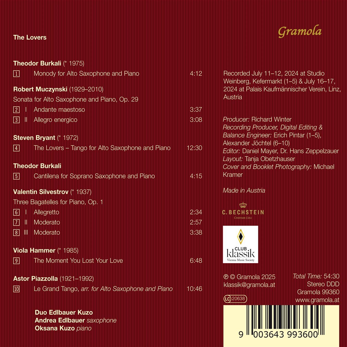 Das Thema des Albums „The Lovers“ des Duos Edlbauer Kuzo (Andrea Edlbauer, Saxophon, und Oksana Kuzo, Klavier) dreht sich um Liebe, Liebende und die Beziehungen zwischen Menschen – die Umstände, in denen wir zusammen und allein leben. Die Musik versetzt die Zuhörer in verschiedene Stimmungen und lässt sie eine Vielfalt von Gefühlen und Ausdrucksformen erleben. Dieses Album enthält eine Zusammenstellung aus Werken, die von Kennern des Saxophon-Klavier-Repertoires bereits geschätzt werden, wie Robert Muczynskis Sonate oder Astor Piazzollas „Grand Tango“ in einer Bearbeitung für Saxophon und Klavier, sowie völlig neue Stücke, die für das Duo komponiert wurden. Diese neuen Werke zeichnen sich durch eine Musiksprache aus, die sofort berührt und die Herzen der Zuhörer erobert, wie beispielsweise „The Moment You Lost Your Love“ der jungen österreichischen Komponistin Viola Hammer, die atmosphärische Musik „Monody“ des in Österreich lebenden Komponisten Theodor Burkali und das leidenschaftliche, temperamentvolle und facettenreiche Titelwerk „The Lovers“ des amerikanischen Komponisten Steve Bryant. Ebenfalls zu hören sind die „Three Bagatelles for Piano“ des ukrainischen Komponisten Valentin Silvestrov und die „Cantilena“ von Theodor Burkali.
