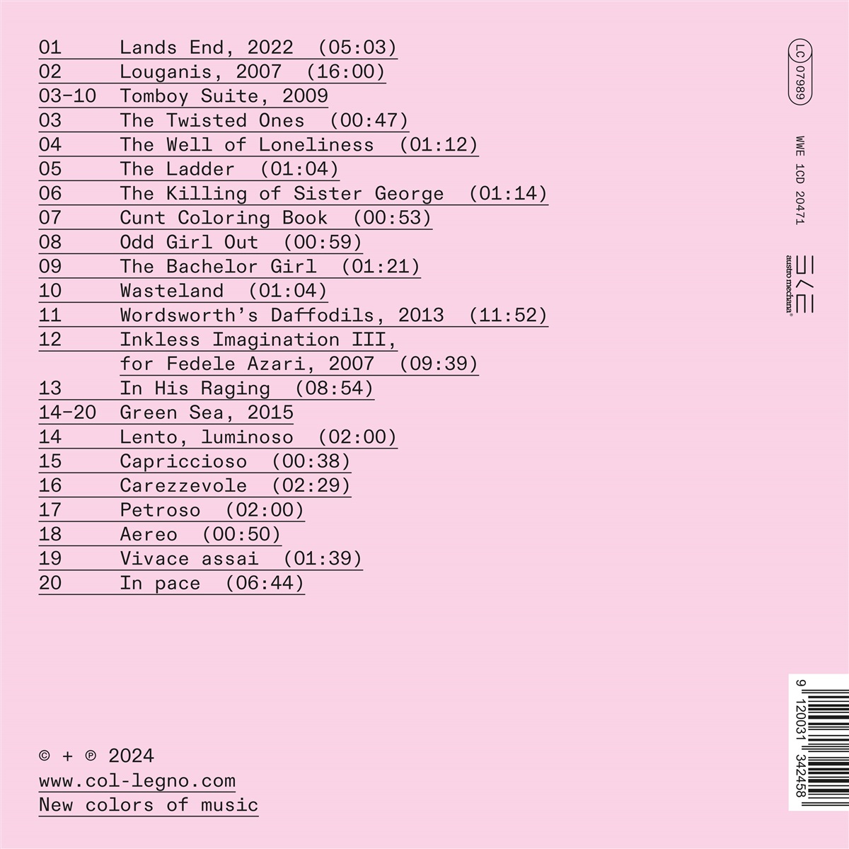 „Lands End“ entstand in der Caldwell-Blaney Residenz in San Francisco und ist Ugo Rondinone gewidmet. „Wordsworth's Daffodils“ wurde von New Keys in Auftrag gegeben, „Inkless Imagination Nr. III“ für Fedele Azari entstand im Rahmen des Djerassi Resident Artists Program. „In His Raging“ entstand in Les Ateliers du Quai in Monaco und ist Sonia Pastor gewidmet. „Green Sea“ schließlich wurde von Sarah Cahill in Auftrag gegeben und Terry Riley zum 80. Geburtstag gewidmet. Es entstand im Rahmen der Civitella Ranieri Art Residency.