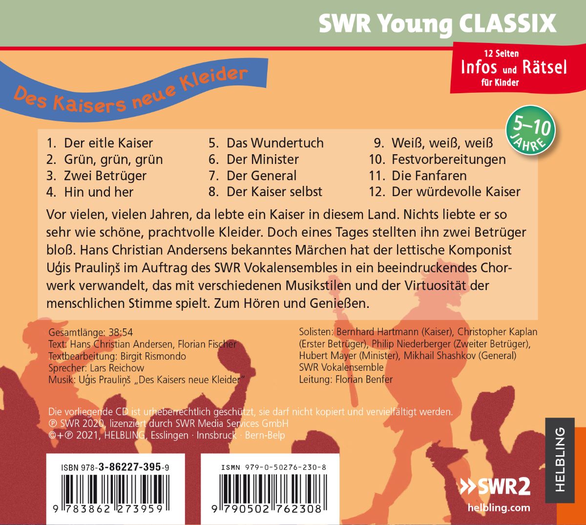 „Vor vielen Jahren lebte ein Kaiser, der so ungeheuer viel auf neue Kleider hielt, daß er all' sein Geld dafür ausgab, um recht geputzt zu sein.“ So beginnt Hans Christian Andersens populäres und äußerst lehrreiches Märchen von „Des Kaisers neue Kleider“, das (nicht nur) die Kinder bis heute fasziniert. Der lettische Komponist U?is Prauli?š hat im Auftrag des SWR Vokalensembles daraus ein beeindruckendes Chorwerk erstellt, das mit Musikstilen und der Virtuosität der menschlichen Stimme spielt. Als Erzähler ist Lars Reichow zu hören.